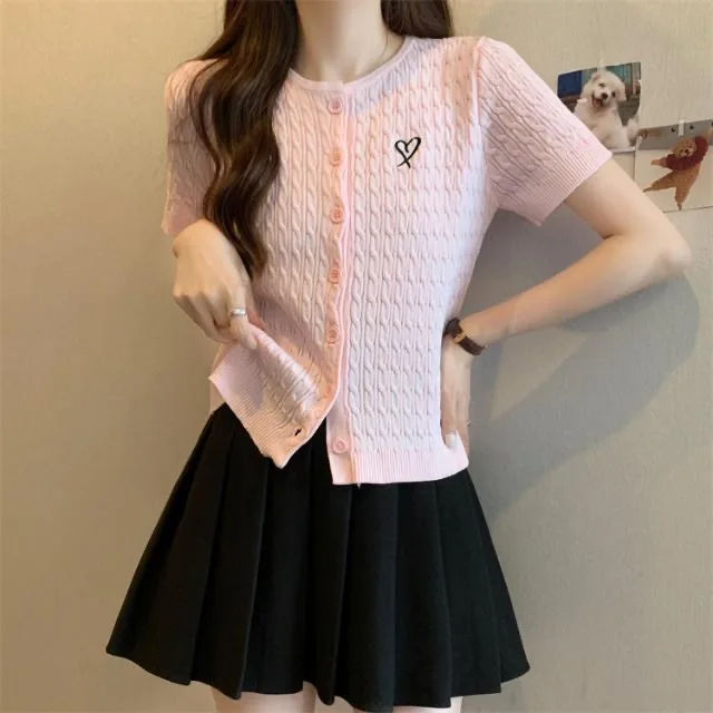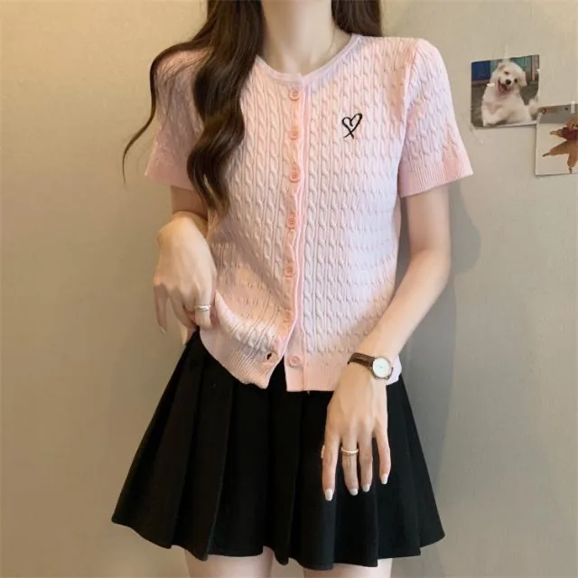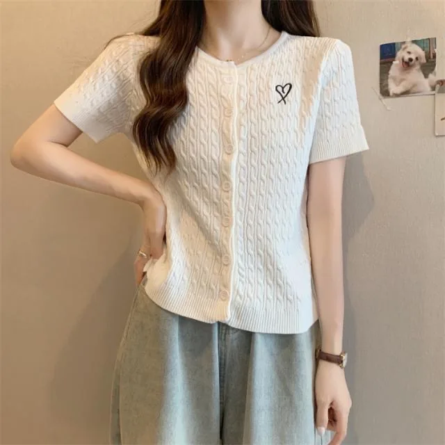 Women's Elegant Summer Casual Chic Short Sleeve Knitted T-Shirt Slim Fit Embroidered Cardigan Single Breasted Chic Breathable