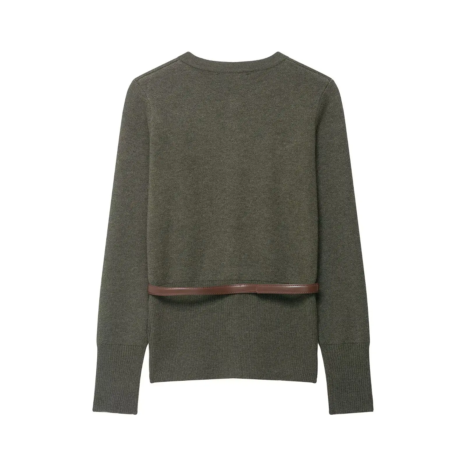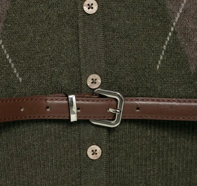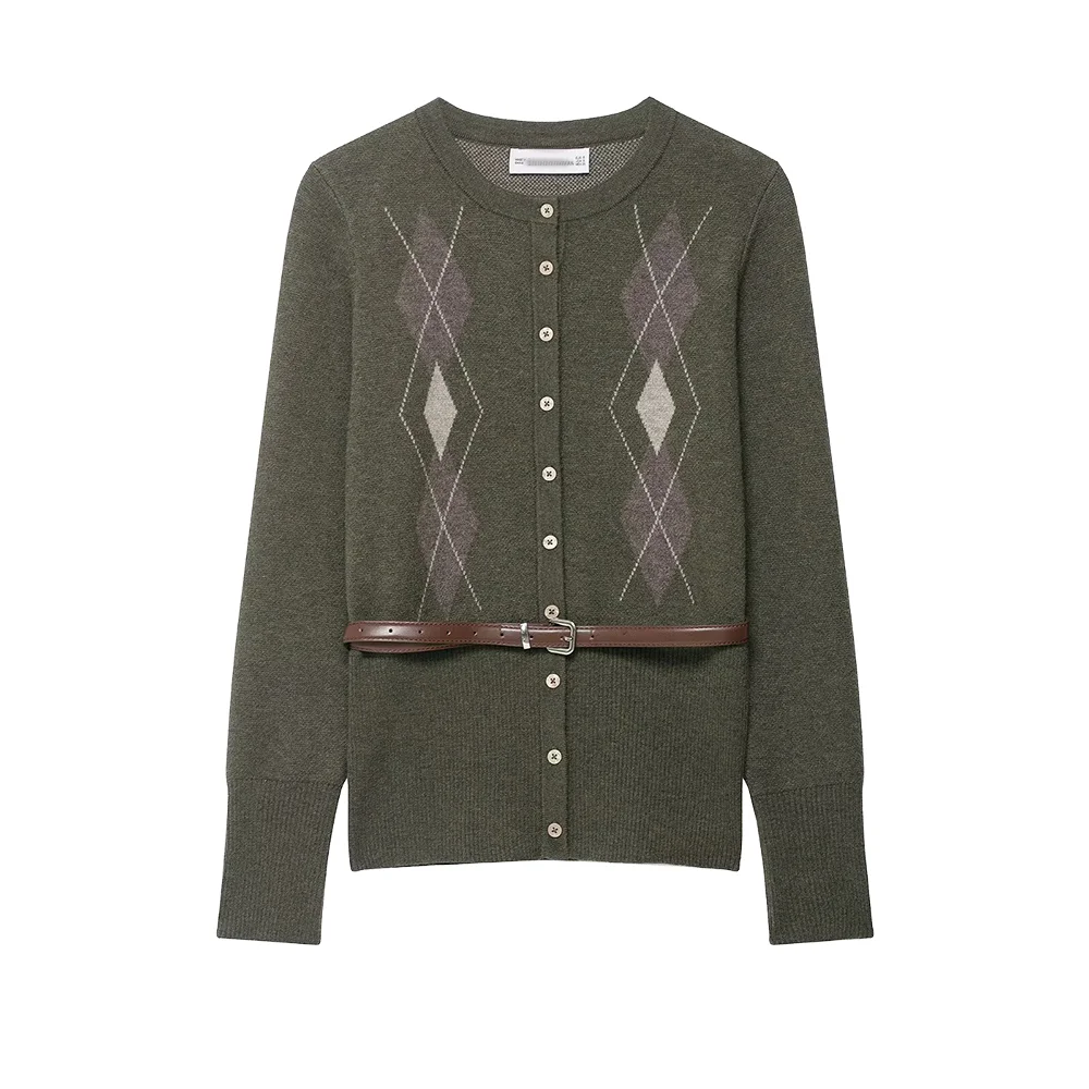 Women 2025 Autumn New Fashion Belt Geometric Button Knitted Cardigan Sweater Vintage Long Sleeve Casual Outerwear 100% Polyester