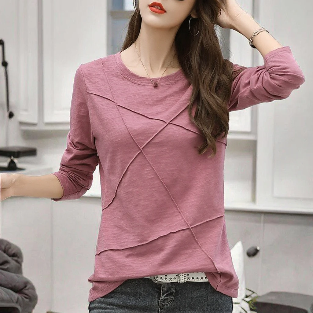 Autumn Korea Design Slim Women's O-Neck Casual Long-Sleeve Pullover Shirt Solid Color Plain Dyed Irregular Line
