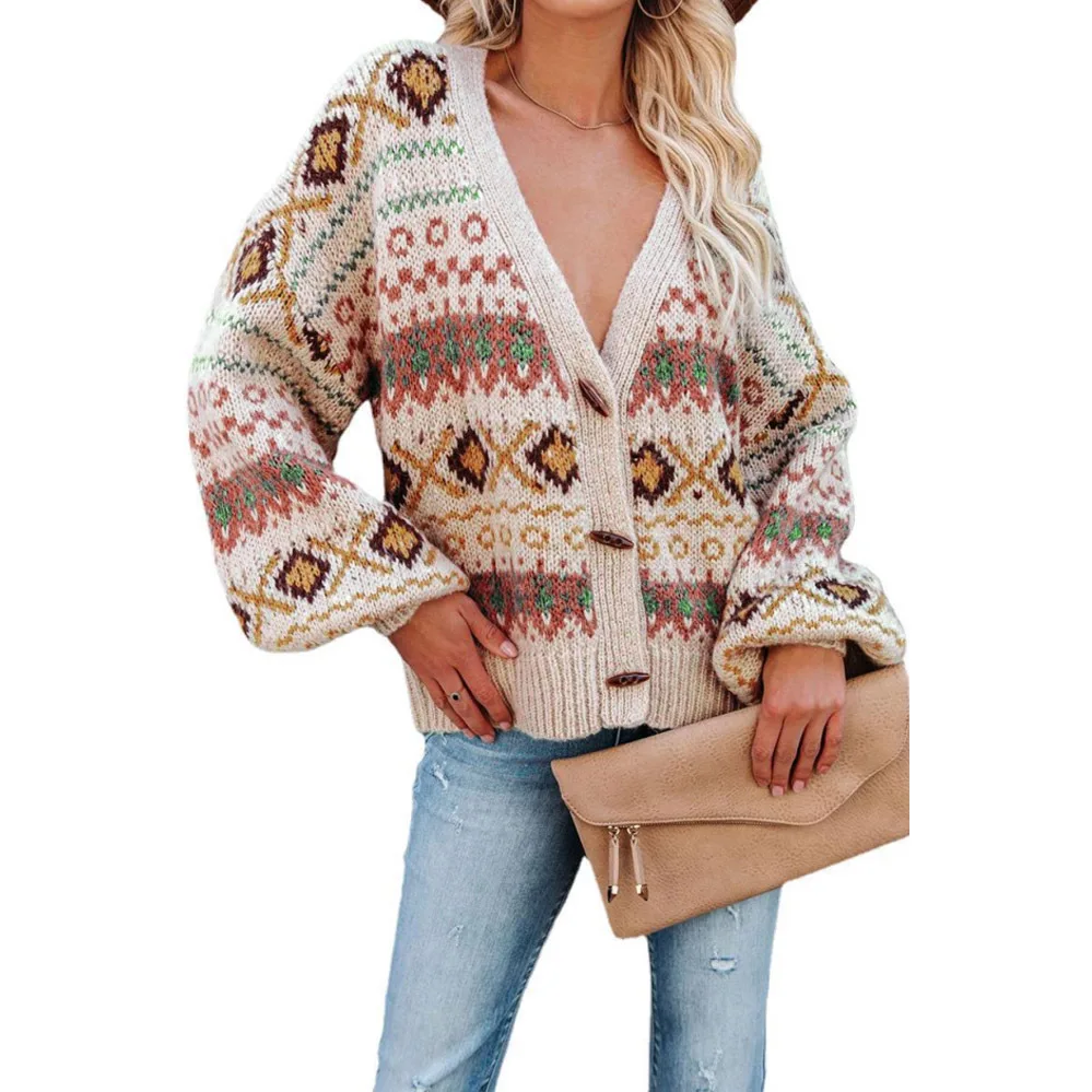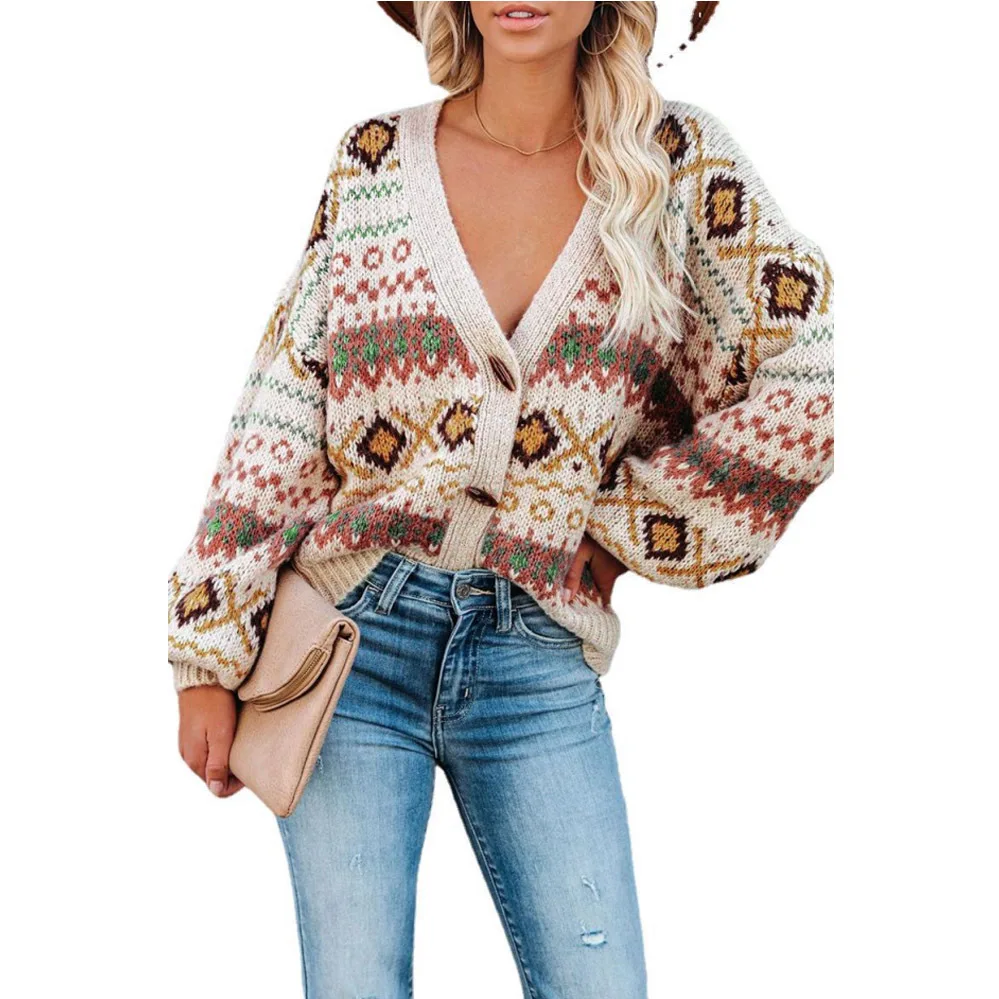 Dear-Lover Wholesale Casual Single Breasted Fashion Chic Western Pattern Winter Knitted Button V Neck Cardigan Sweater