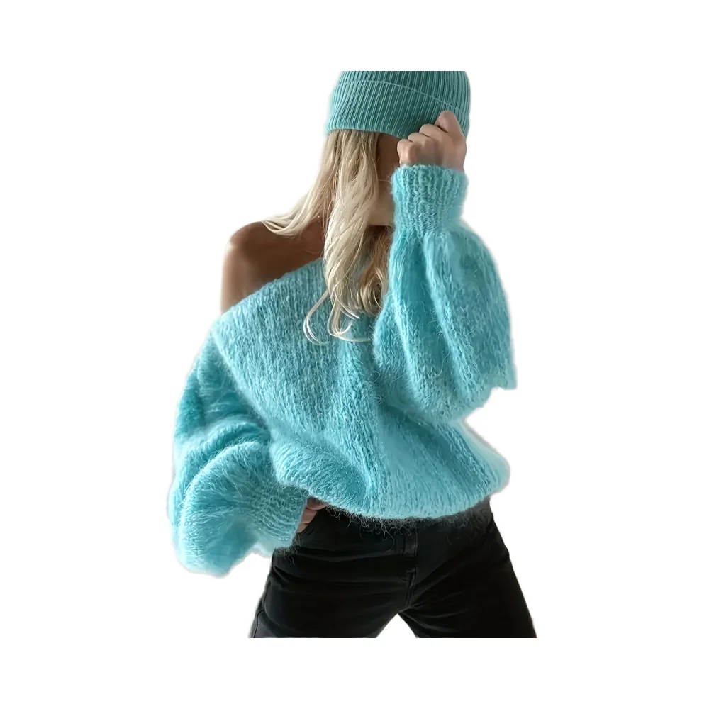 European American Women's Vintage Style Pullover Sweater Winter Knitted Design with Solid Color Loose Lantern Sleeve Front Logo