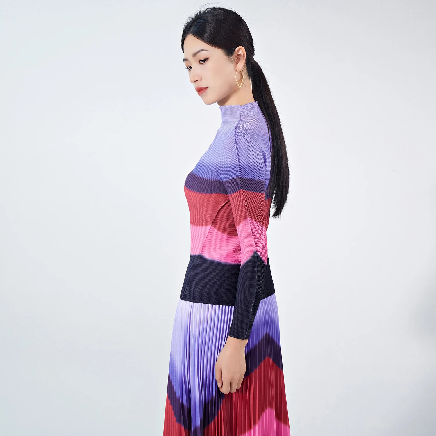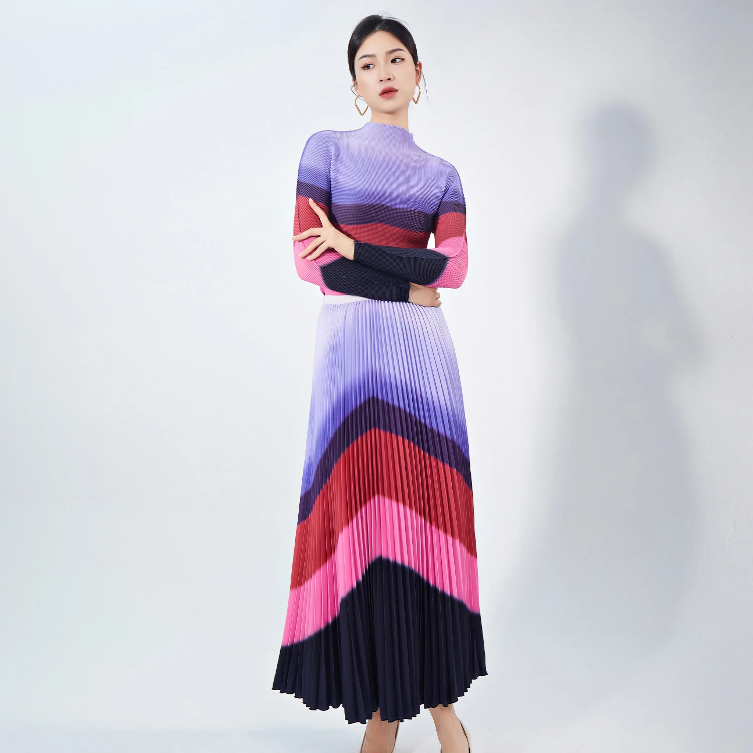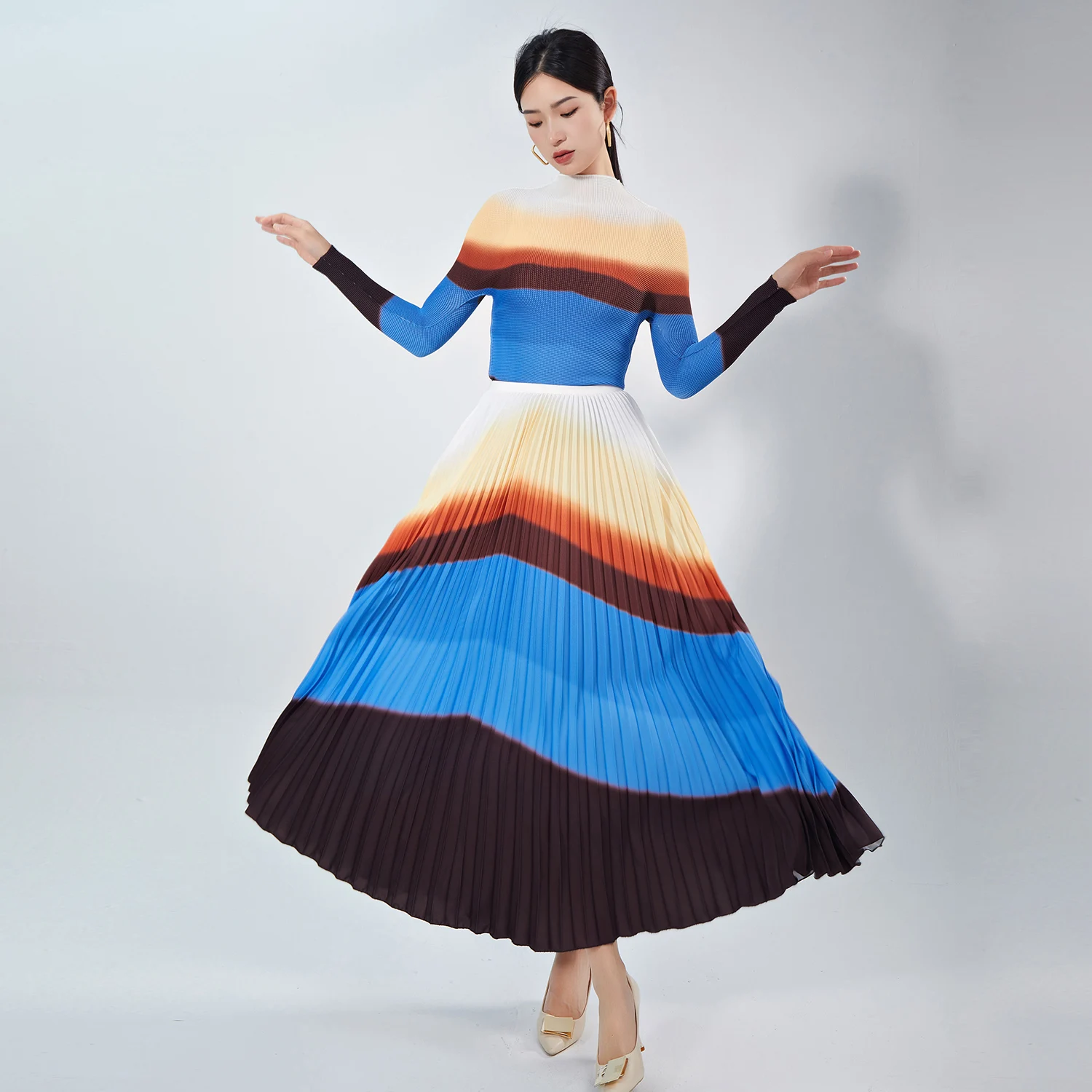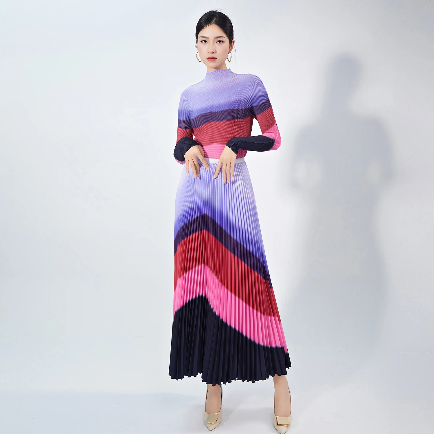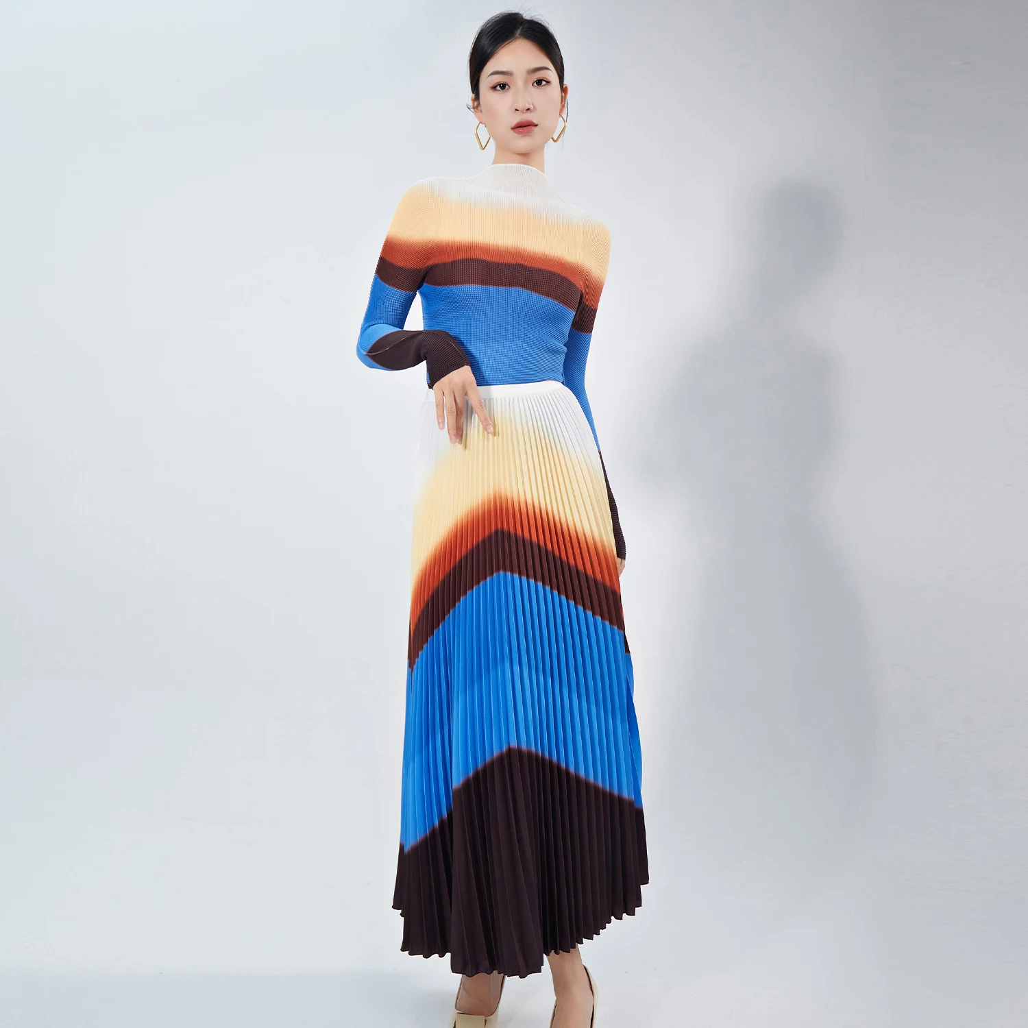 High Quality Women's Casual Striped Stretch Top and Pleated Skirt Elegant Two-Piece Set for Autumn Made of Polyester Fabric