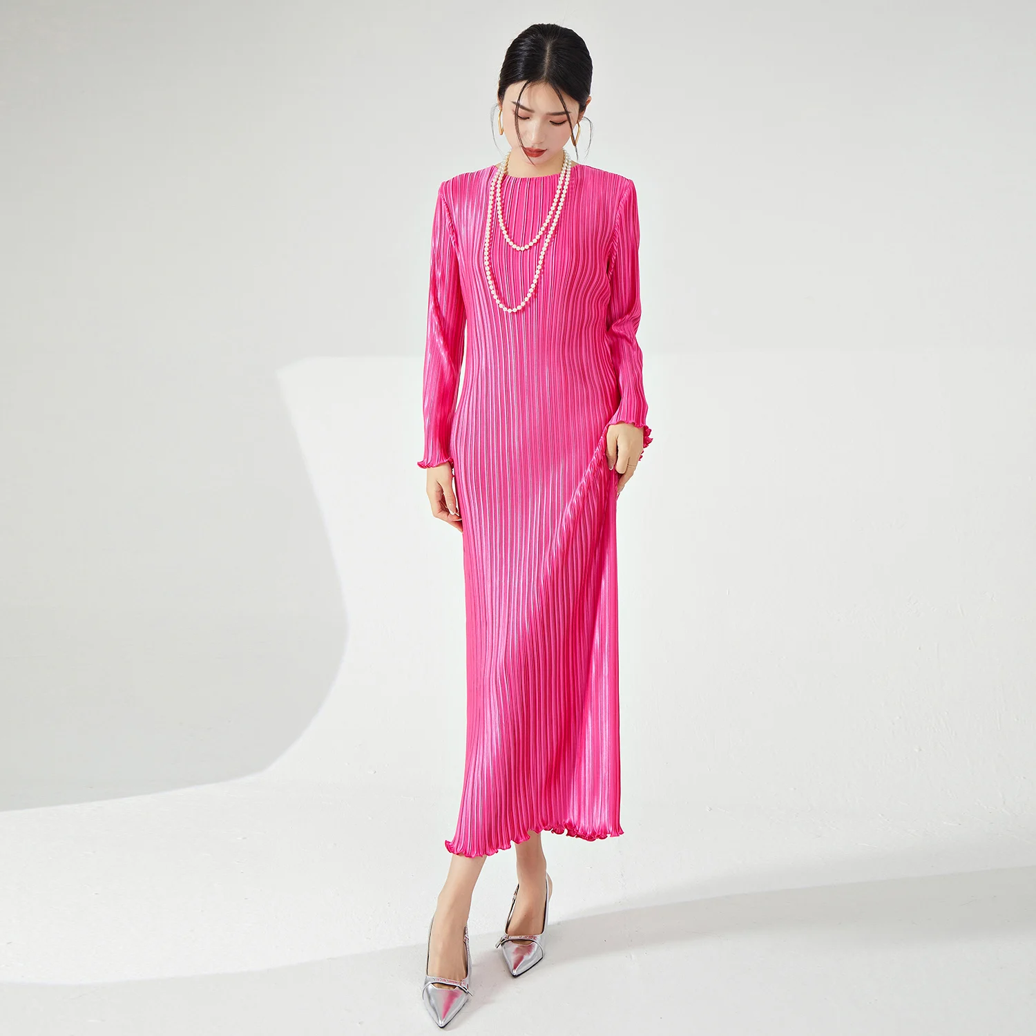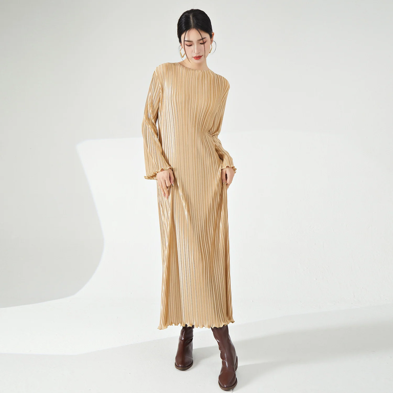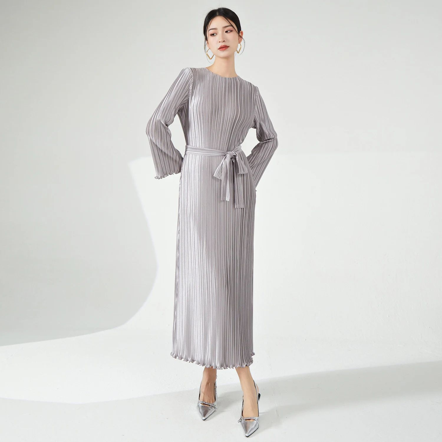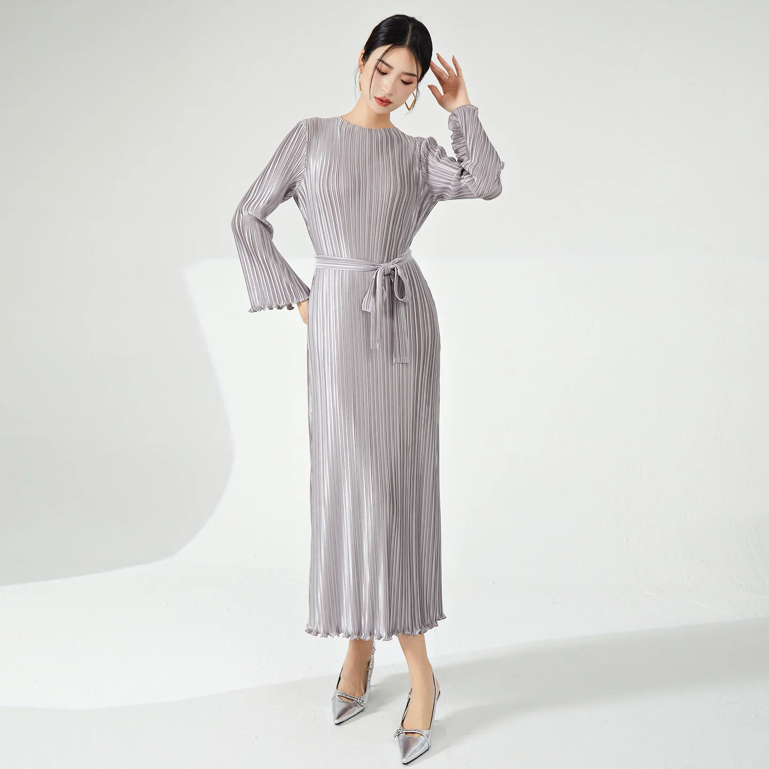 2025 New Fashion High Quality Women's Pleated Long Dress Elastic Stretch Belt Temperament Miyake Dress
