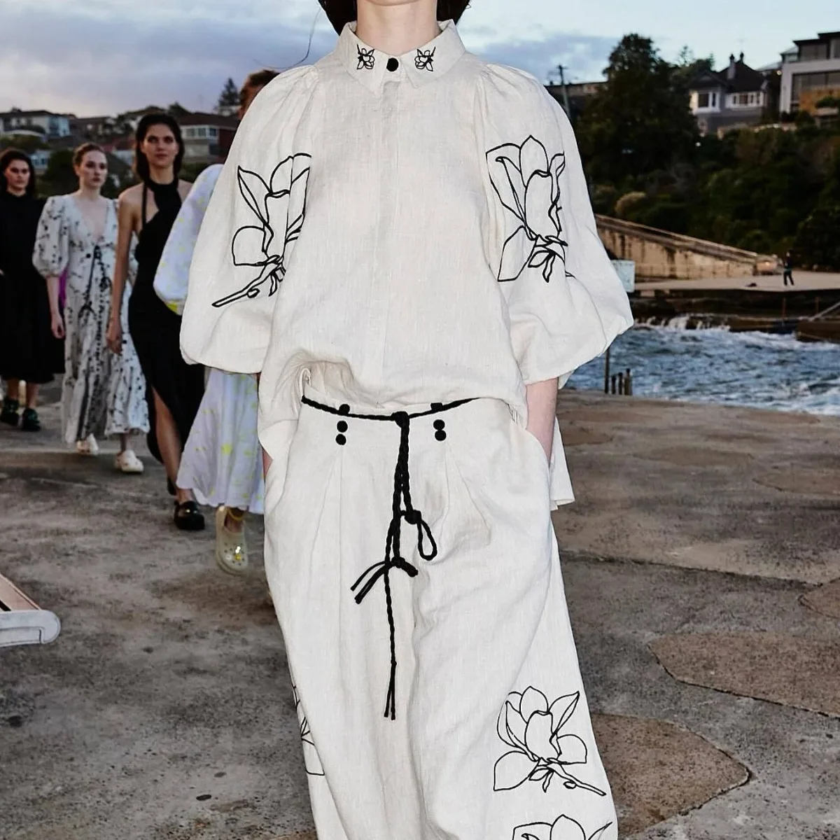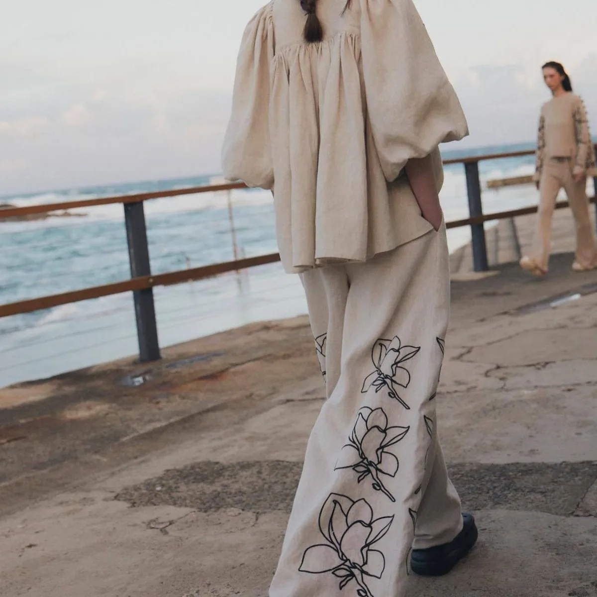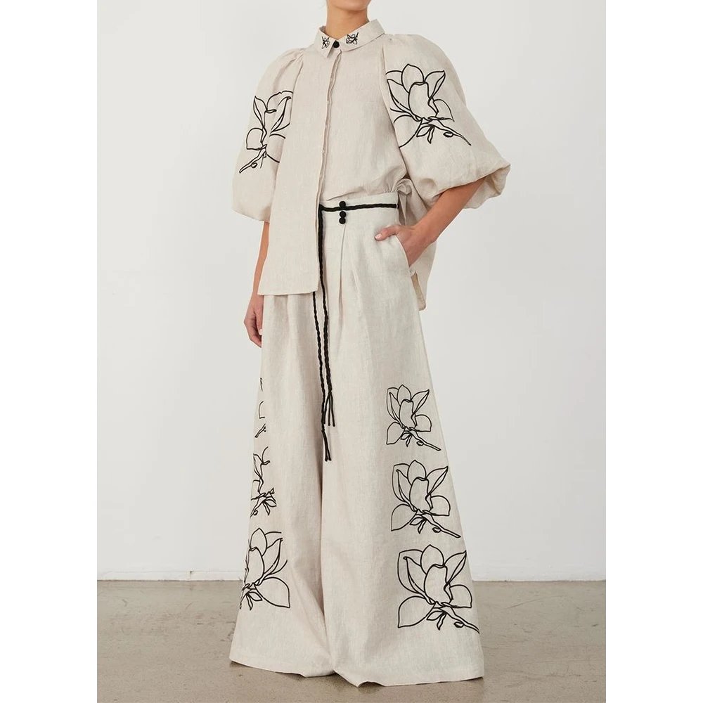 Casual Womens Outfits Loose Long Sleeve Printed Shirt and High Waist Wide Leg Pants Set Cotton Linen Women Elegant Two Piece Set