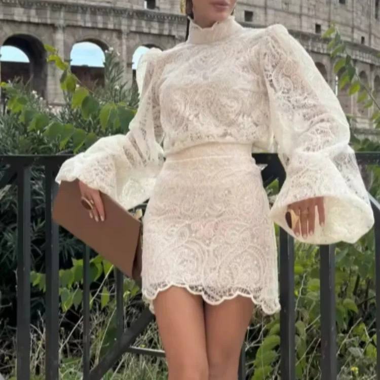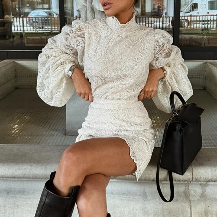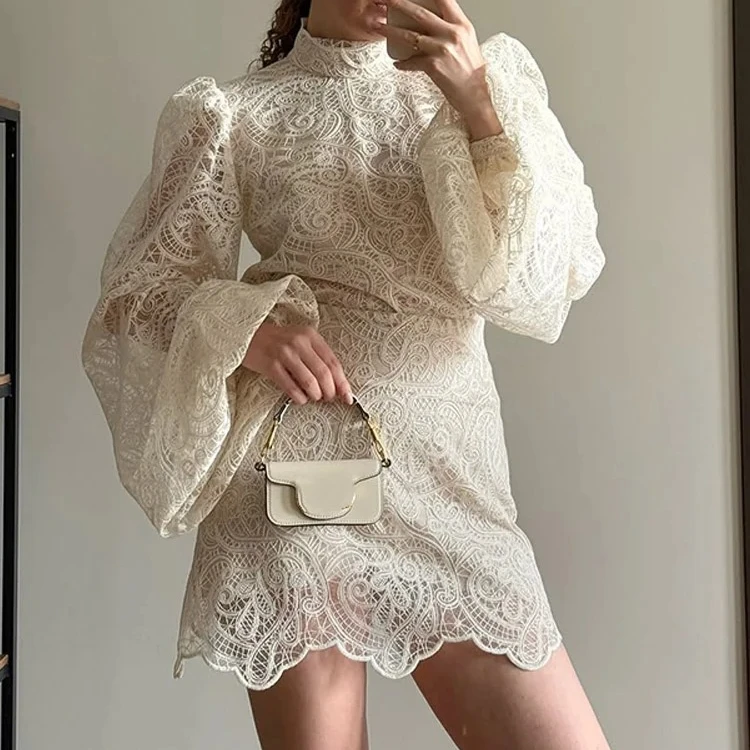 2026 New Fashion White Lace Dresses Club Evening Party Robes Elegant Solid Flared Sleeve High Neck Slim Pleat Mini Women Dress
