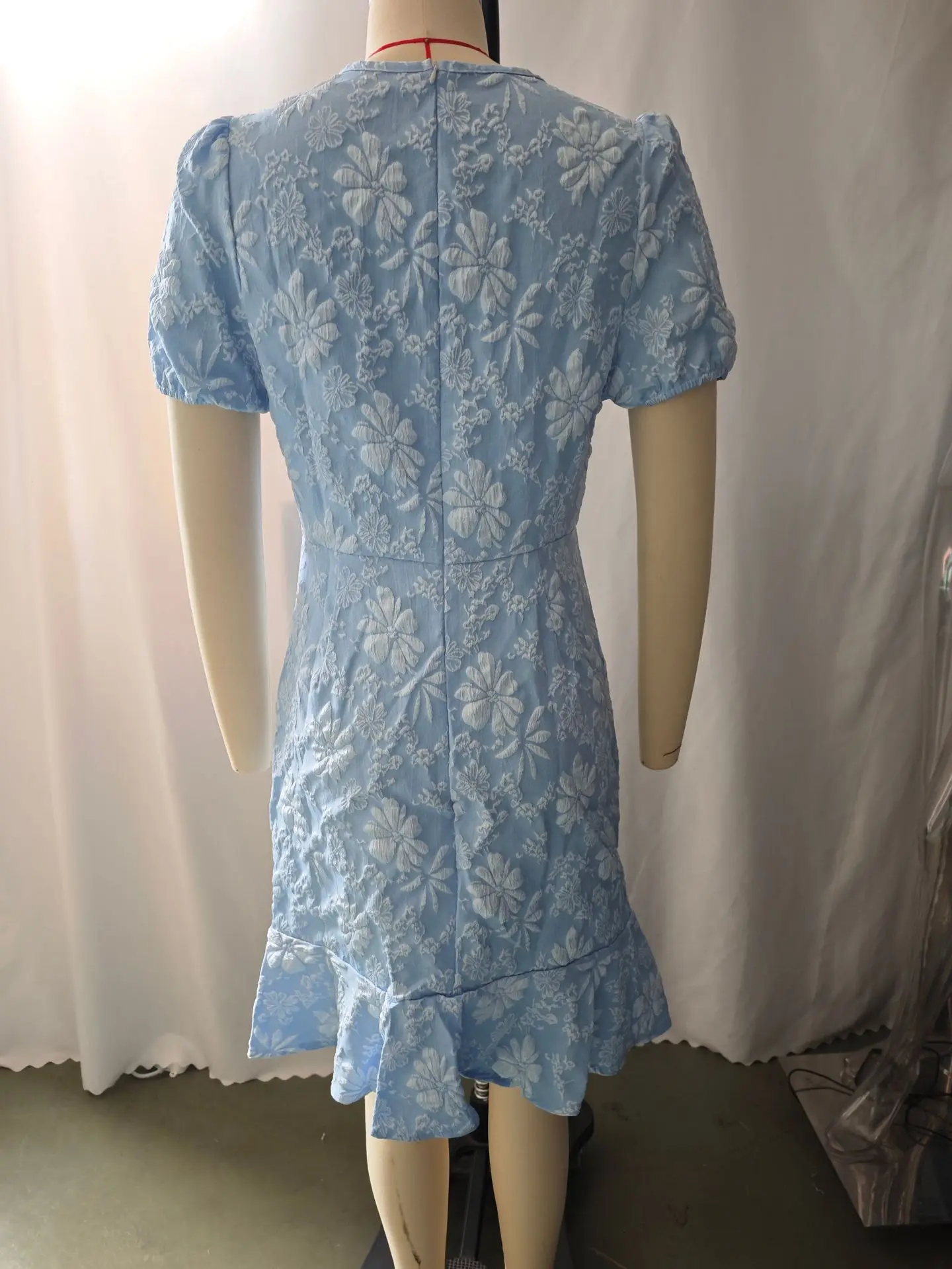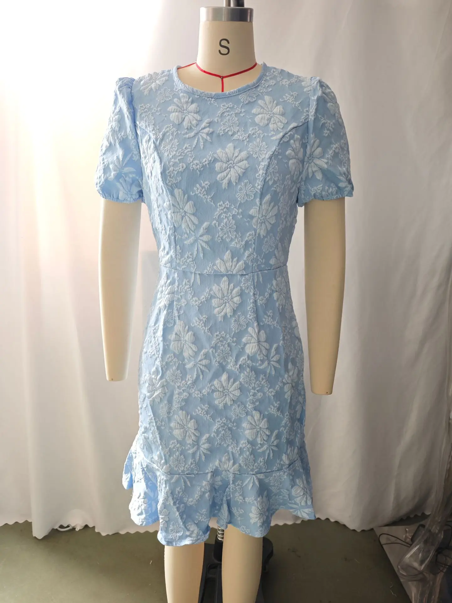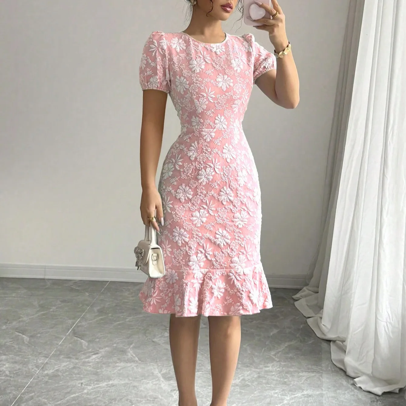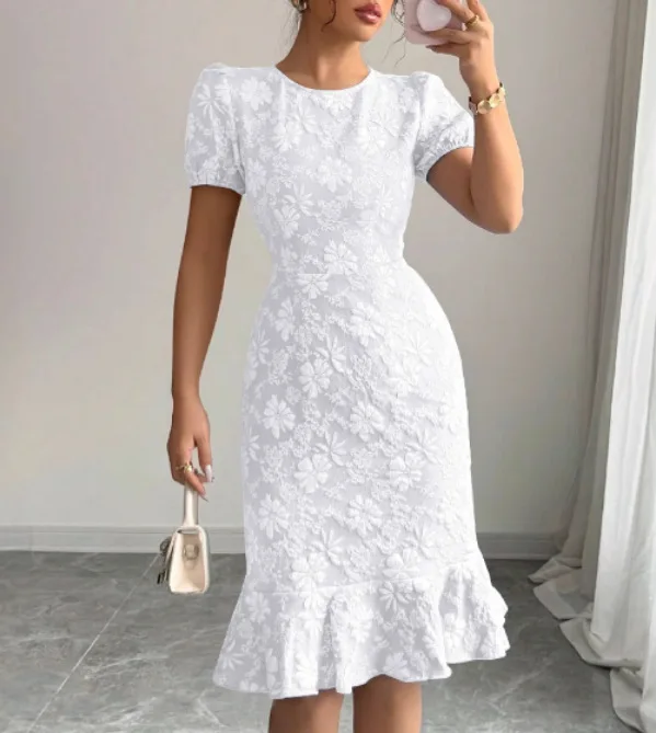 New Elegant Lady Ruffled Hem Short Sleeve Dress Casual All-Match Solid O-Neck Vestido Skinny Hip Covering Slim Knee Length Dress