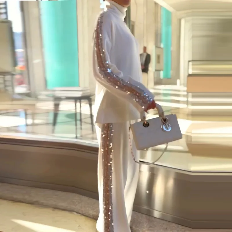 Office Lady Regular Spring 2025 Sequins Splice Tops Turtleneck Loose Fit Straight Pants Two Piece Women Elegant Pant Sets