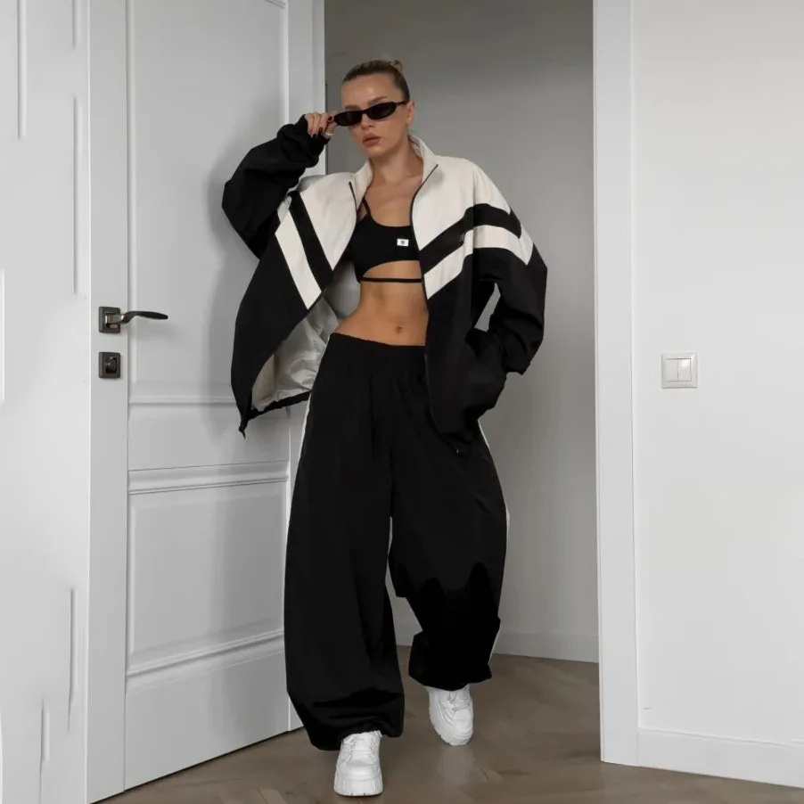 2024 Fashion Gray Patchwork Sets Casual Loose Long Sleeve Zipper Blouses and High Waist Trousers Sets for Women 2 Pieces