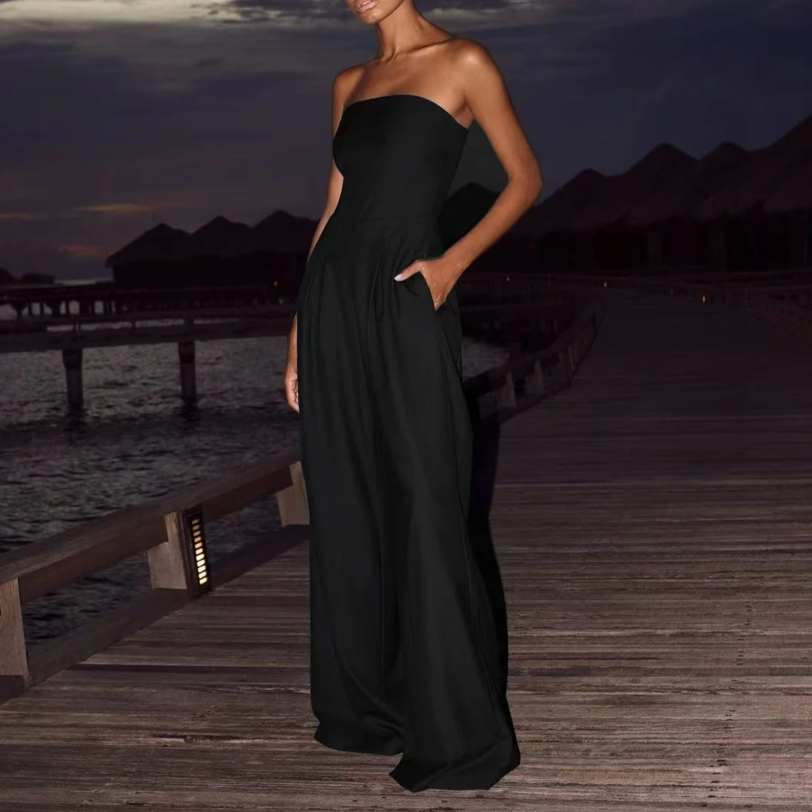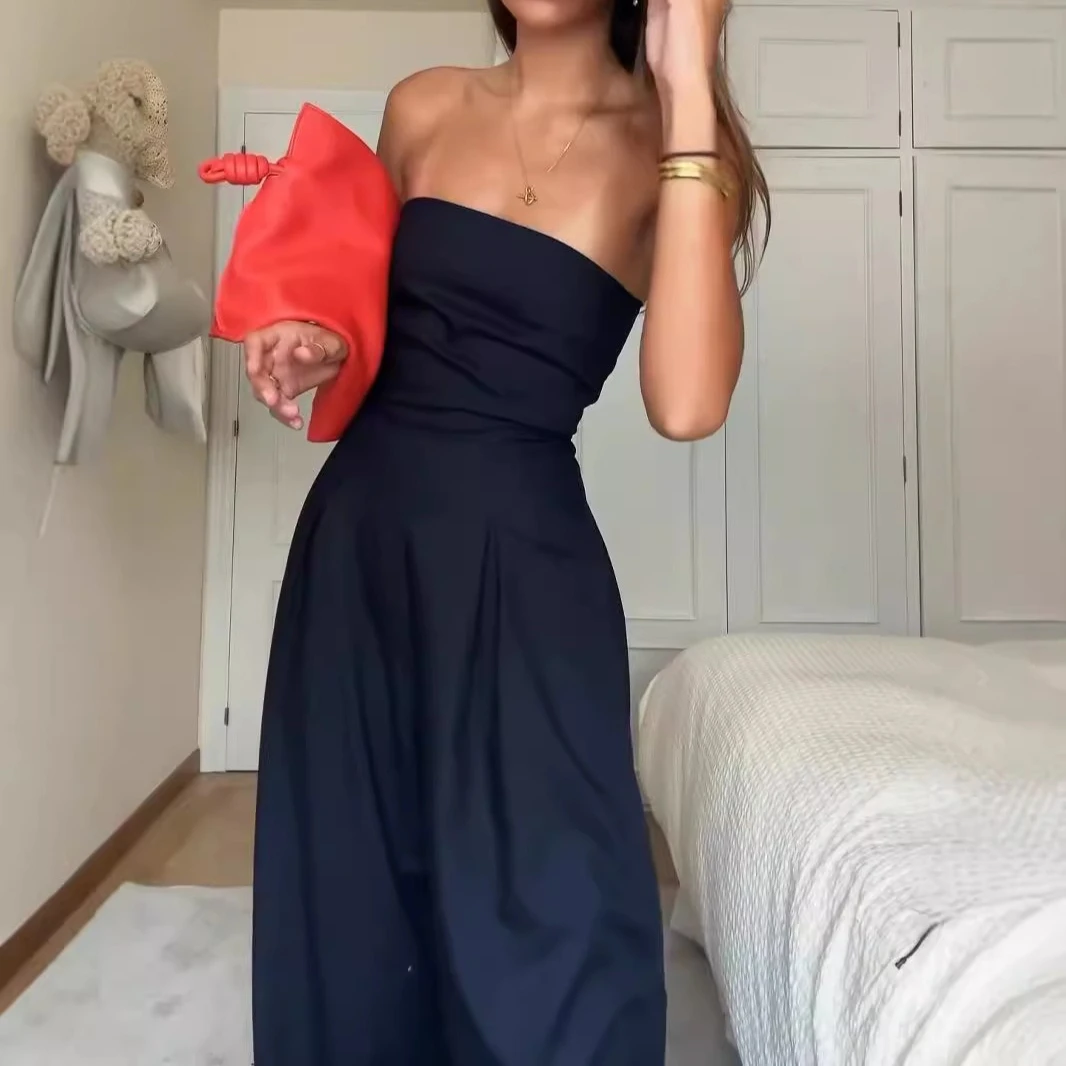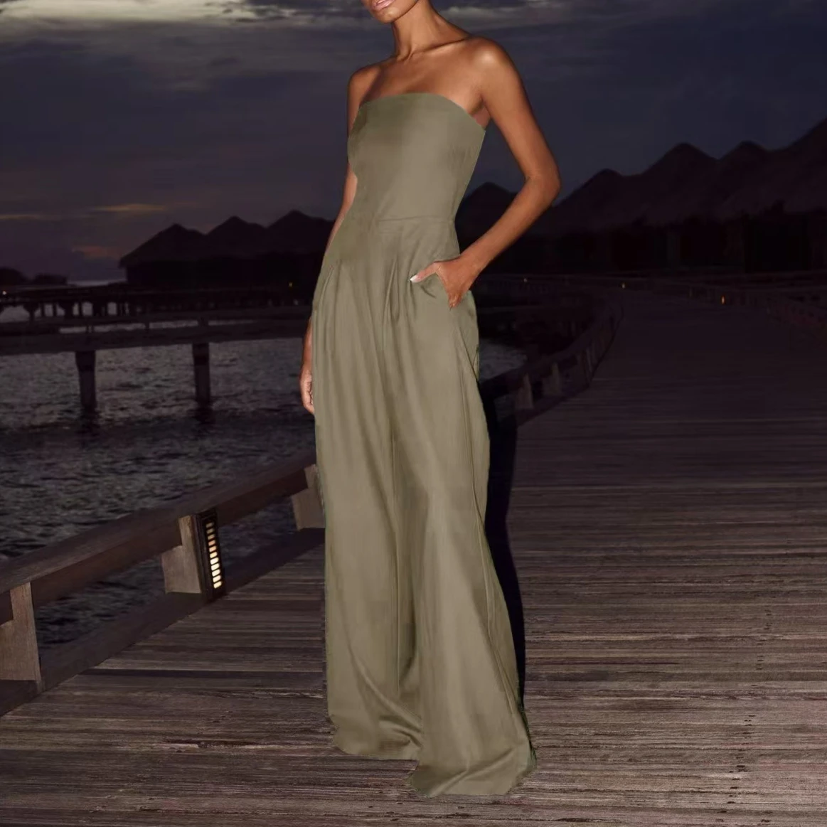 Solid Off Shoulder Waist Cinching Pockets Wide Leg Pants Lady Bodysuit Summer Female Outwears Solid Backless Women's Jumpsuit