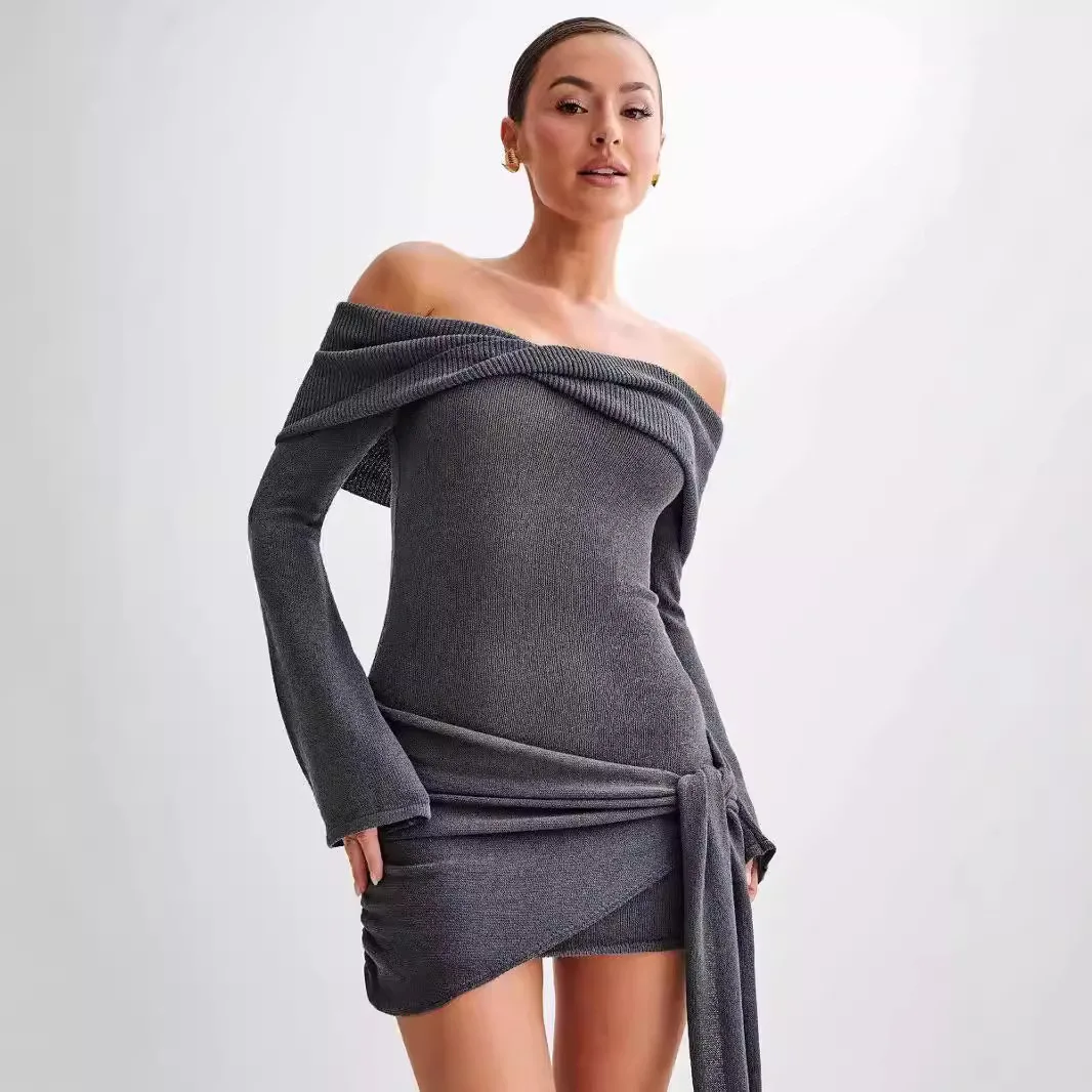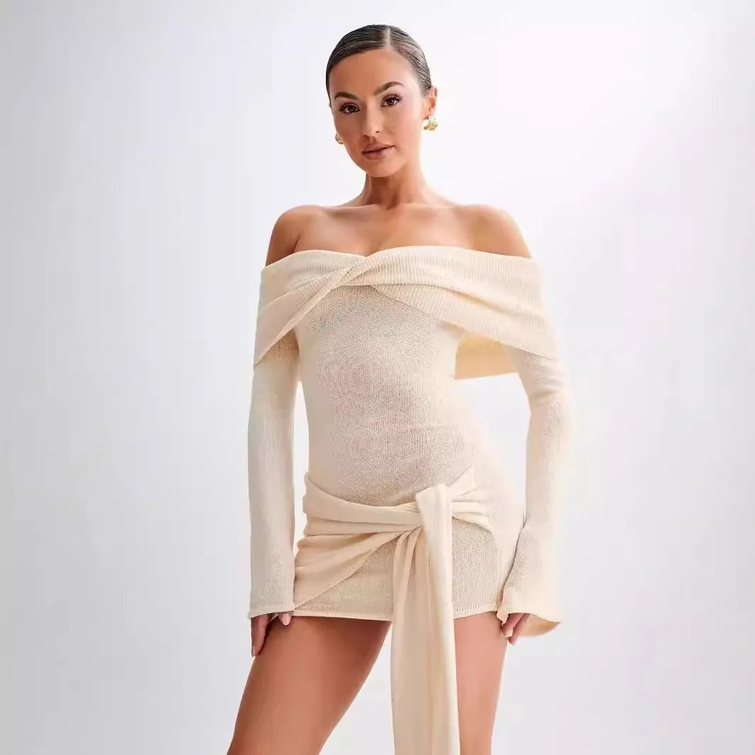 2024 Female Off-Shoulder Slim Patchwork Loose Twist Ribbed Knitwear Dress Women's Party Dresses Knit Sweater Lace-Up Mini Dress