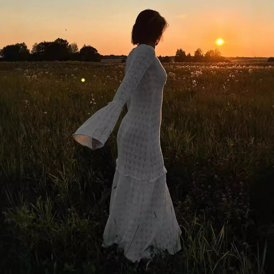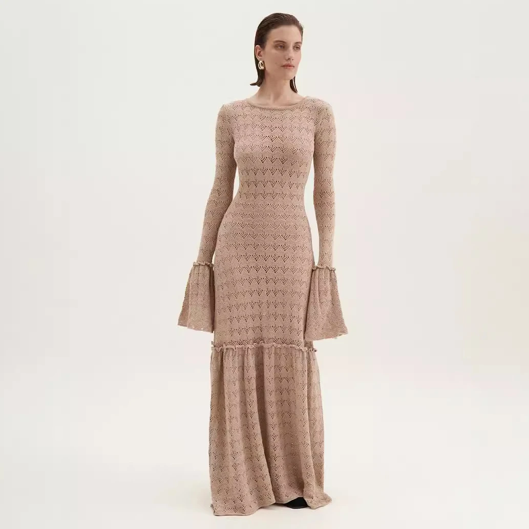 Fashion Summer Long Sleeve Hip Package See Through Patchwork Beach Dress Holiday Lady Robe Women Hollow Out Knitted Maxi Dresses