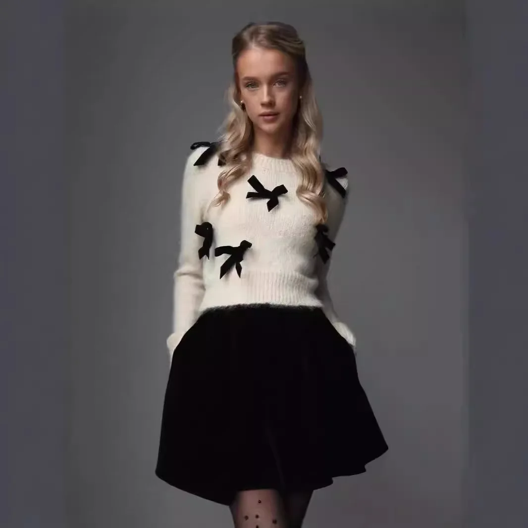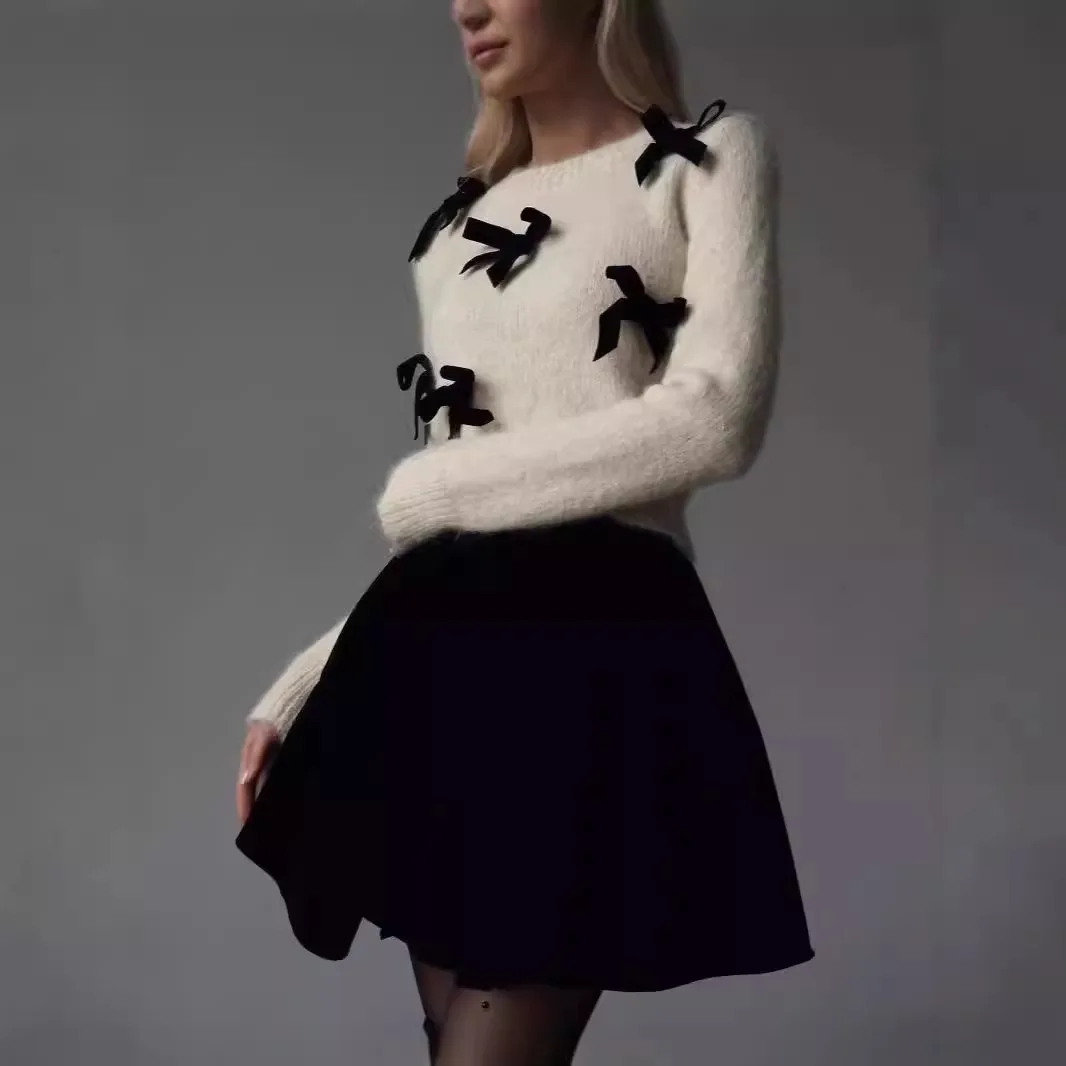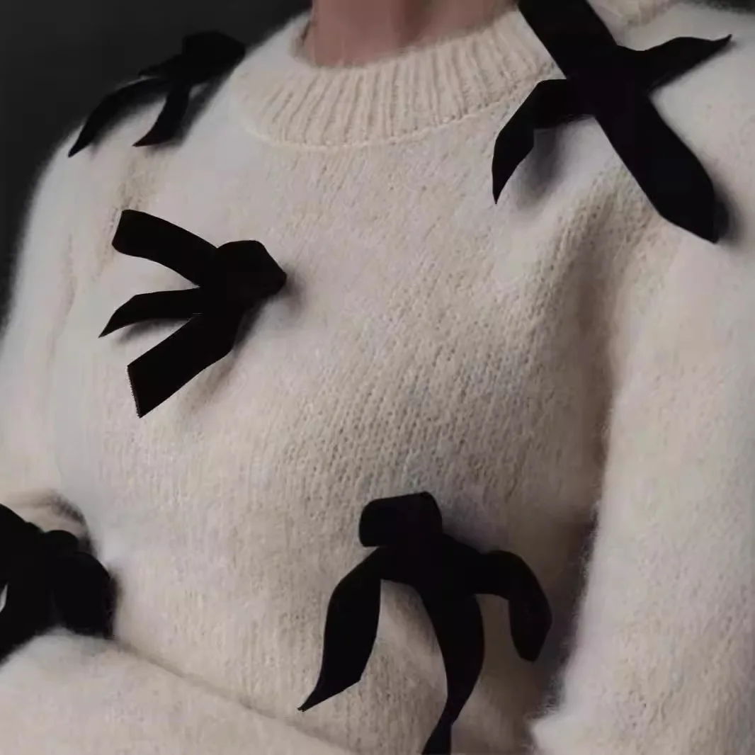 2024 New Autumn Fashion 3d Bow Round Neck Slim Warm Pullover Female Commuting Streetwear Elegant Long Sleeve Sweater for Women