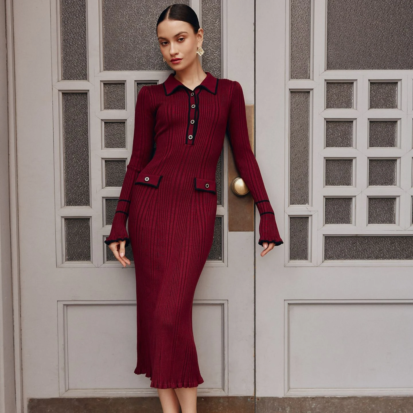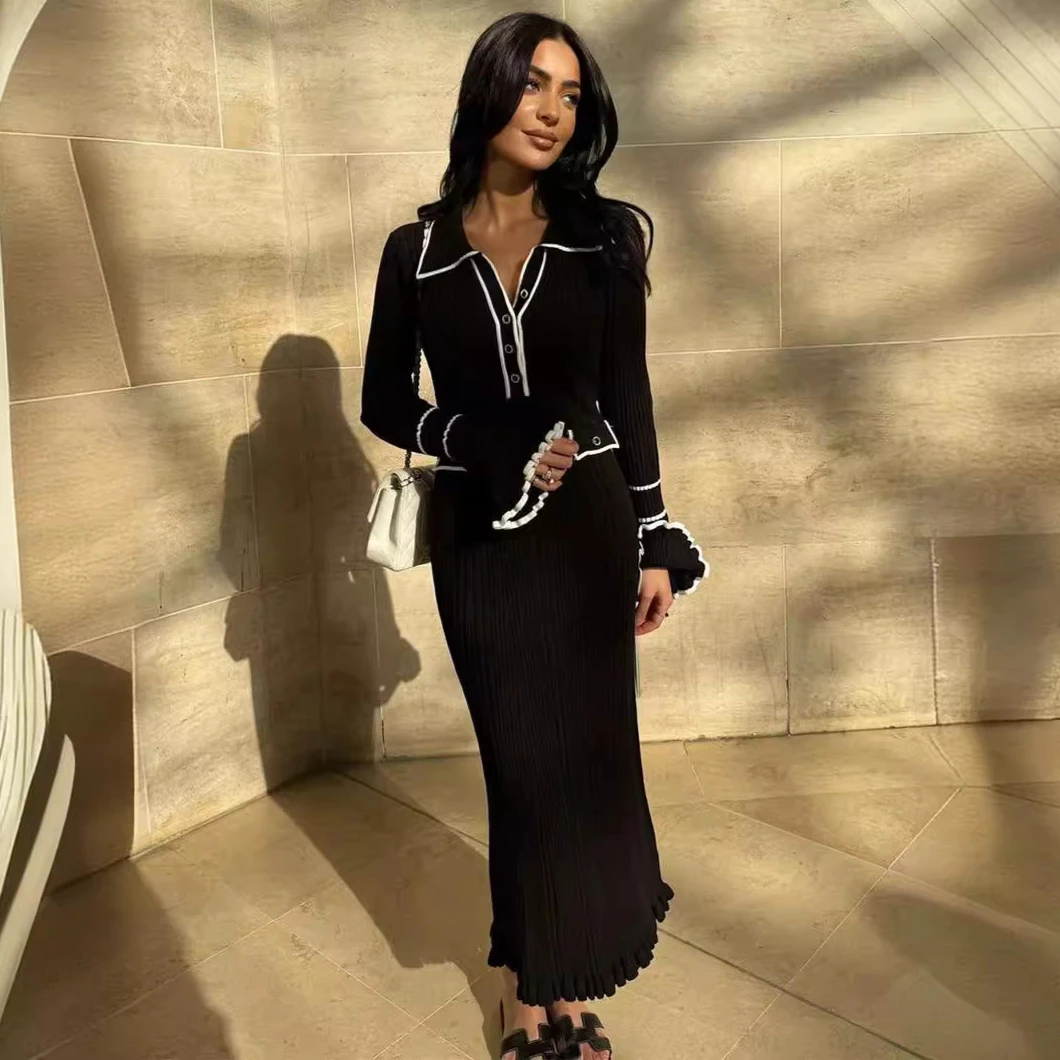 2024 Fashion Lapel High Waist Vestidos Autumn Long Sleeve Single Breasted Midi Dresses Women Contrast Ruffled Knitted Dress