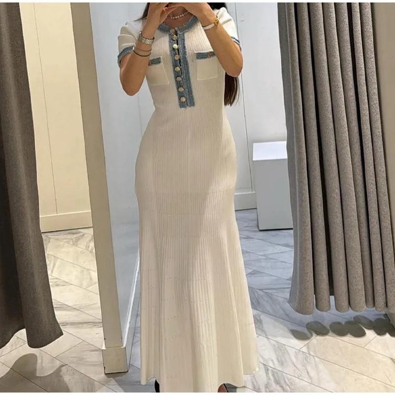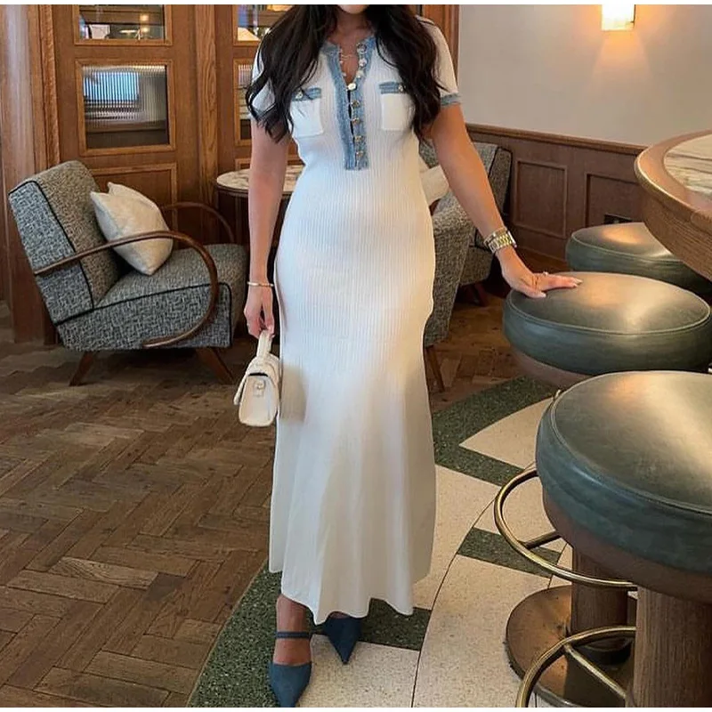 Elegant V Neck Denim Patchwork Knitted Long Dress Office Lady Pockets Robes Women Fashion Short Sleeved Buttons Bodycon Dresses