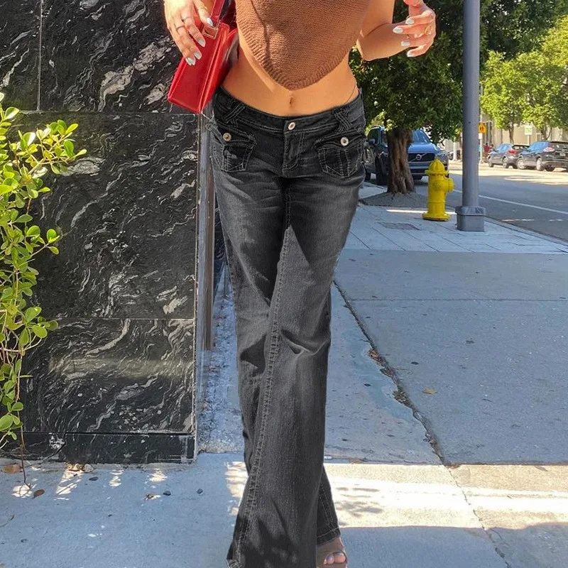 Y2K Flare Low Rise Jeans Pants for Girl Aesthetic Streetwear Pockets Hippie Denim Bell Bottom Casual Outfit Baggy Denim Trousers
