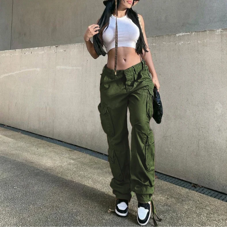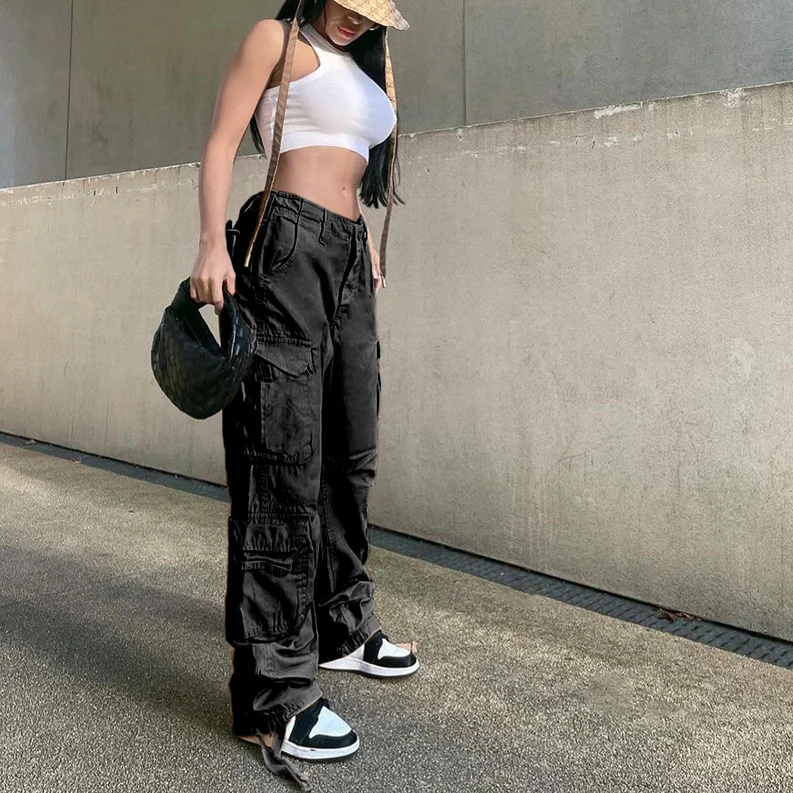 Summer Womens Vintage Grey Cargo Pants Baggy Casual Fashion Multiple Pockets Mom Hip Hop Street Style High Waist Wide Leg Jeans