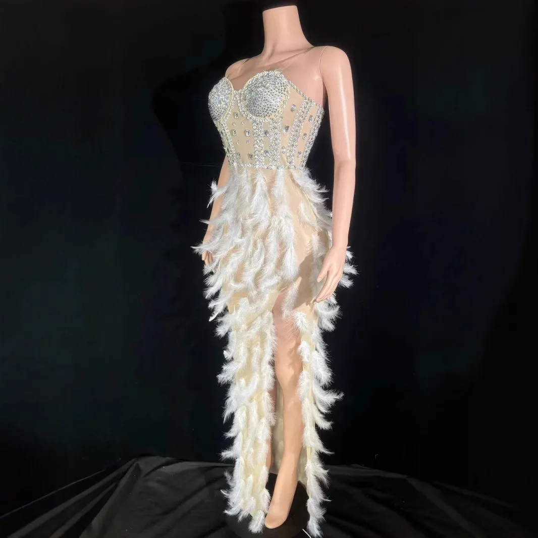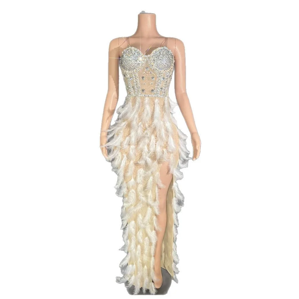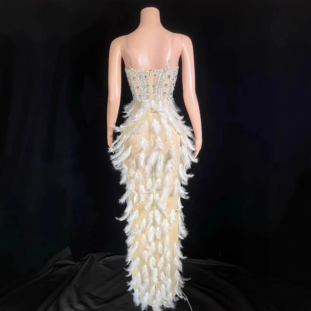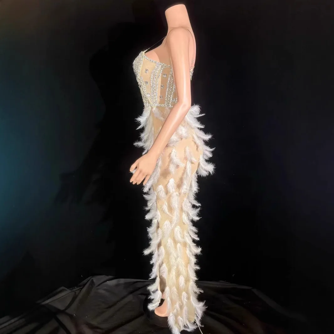 2025 Women Sexy Sparkly Rhinestone Mesh Feather Long Dress Celebrate Birthday Performance Costume Elegant Evening Party Dress