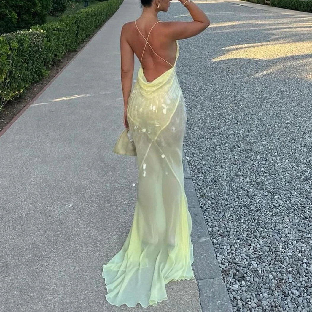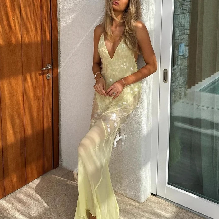 2025 Lady Deep V Sequin Slim Mermaid Dress Casual Off Shoulder Suspender Dresses Sexy Hollow Sleeveless High Waist Evening Dress