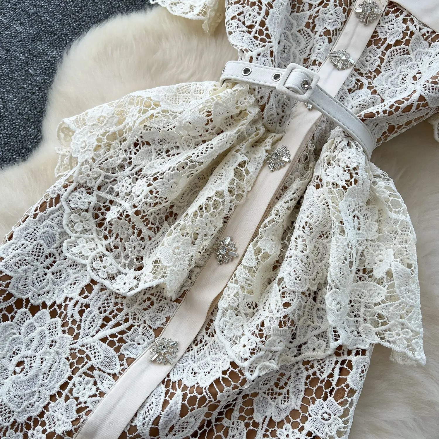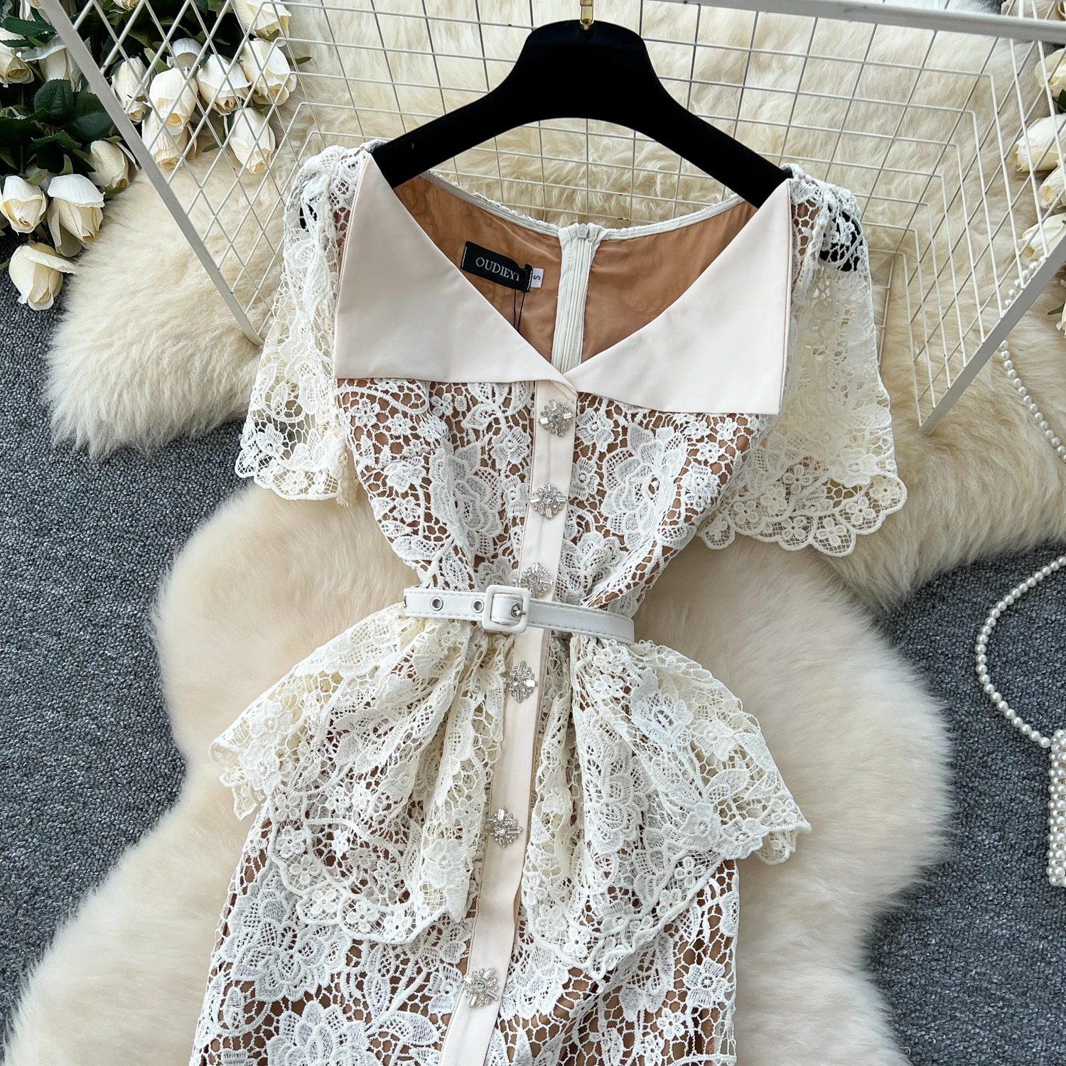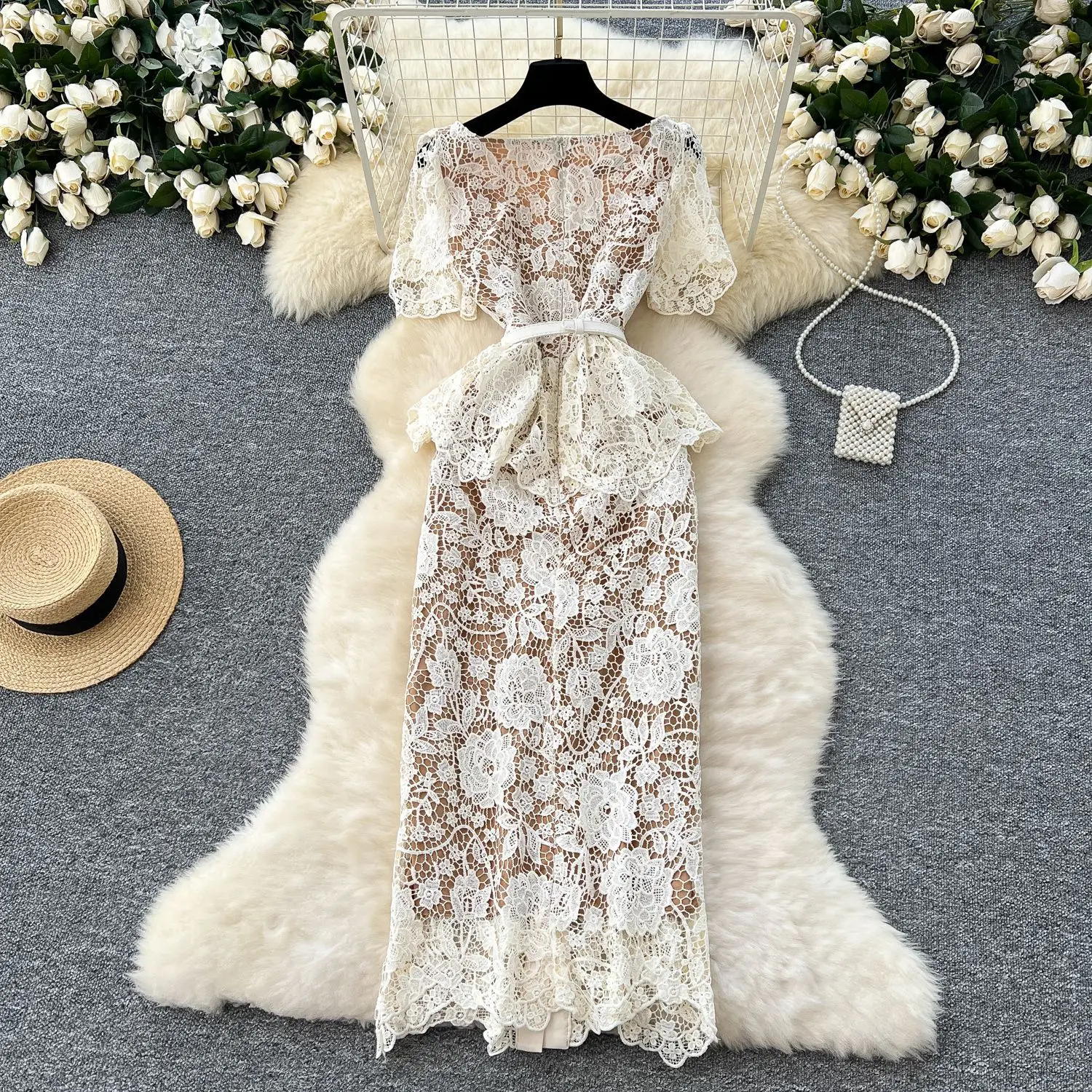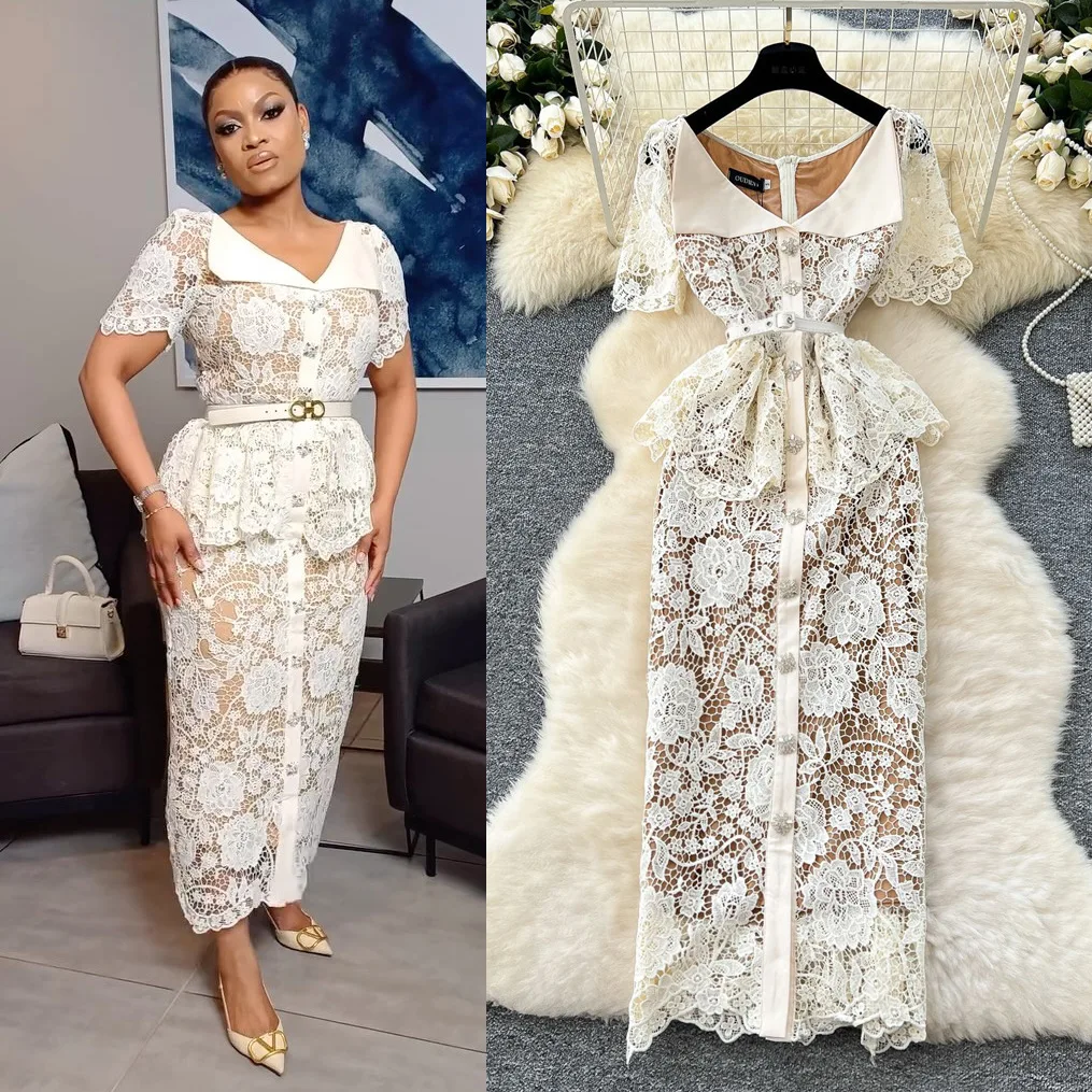 Summer Beaded Diamonds Embroidery Beige White Lace Evening Dress Women Short Sleeve Long Ruffle Peplum Midi Prom Dresses