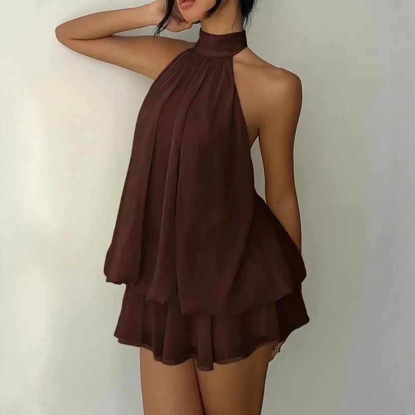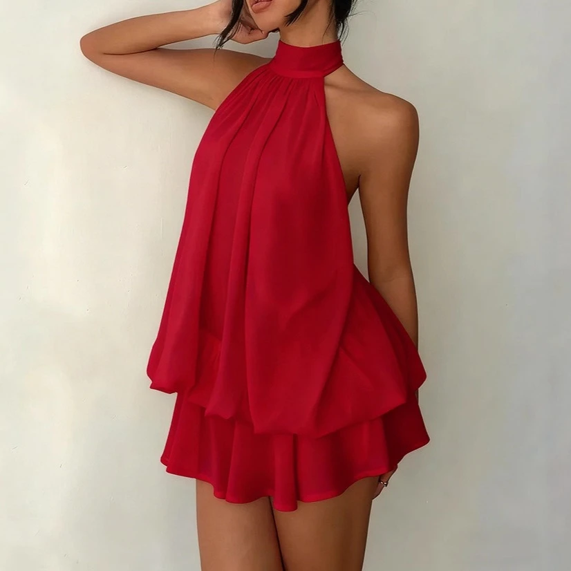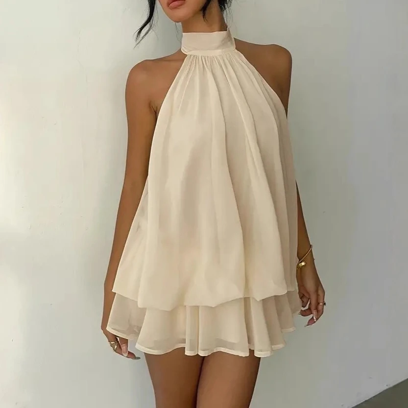 Simple Solid Color Women's Halter Slim Mini Dress Fashion Layered Summer Short Dresses Sexy Backless Hollow Birthday Party Dress