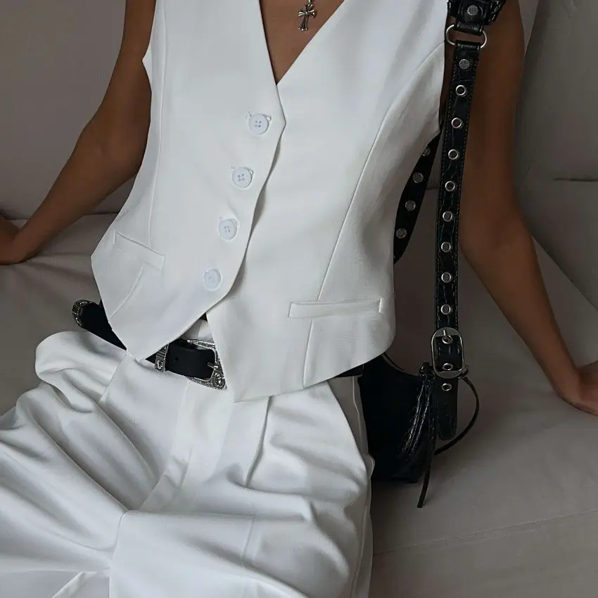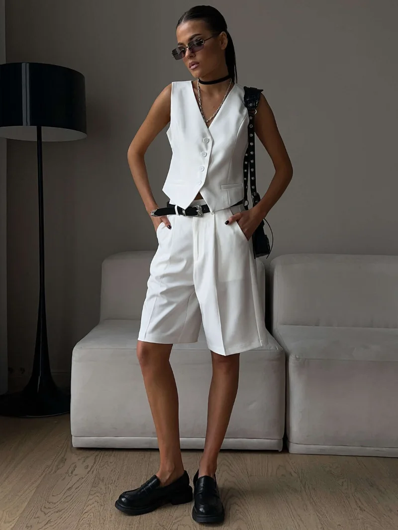 Woman Solid Waistcoat Shorts Set Sleeveless V Neck Buttons Vest Top + Zipper Pockets Commute Elegant Female Short Pant Sets