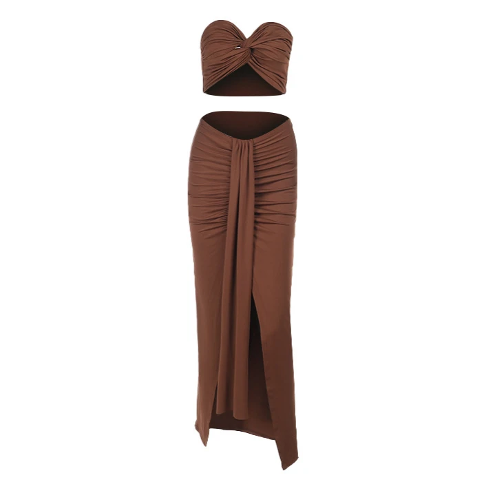 New Arrivals 2025 Elegant Sexy Summer Skirt Suit Vacation Beach Outfits 2 Piece Twisted Tube Top Split Long Skirt Set