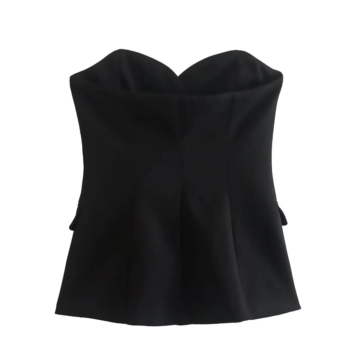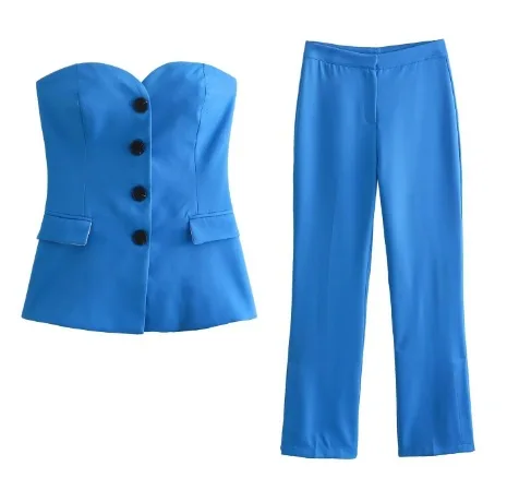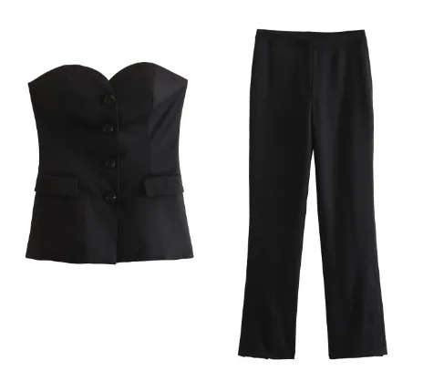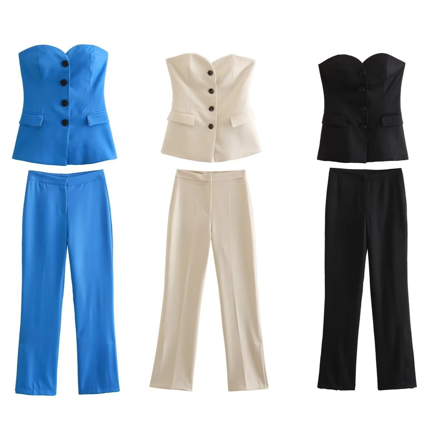 Customize Female Fashion Streetwear Sets Front Button Strapless Sexy Tank Tops + Side Slit Trouser Women Elegant Solid Pant Suit