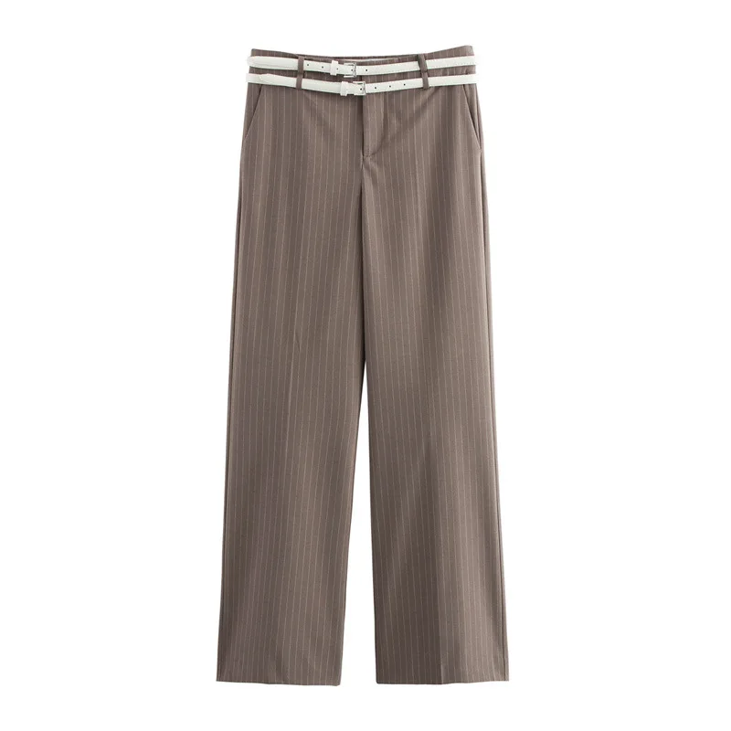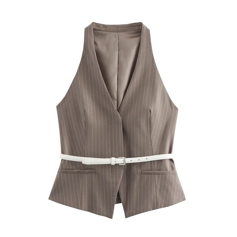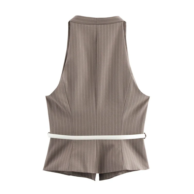 2025 Women's Fashion Two-Piece Set with Belt Striped Waistcoat Top and Low Waist Side Pockets Pants Female Striped Outfit