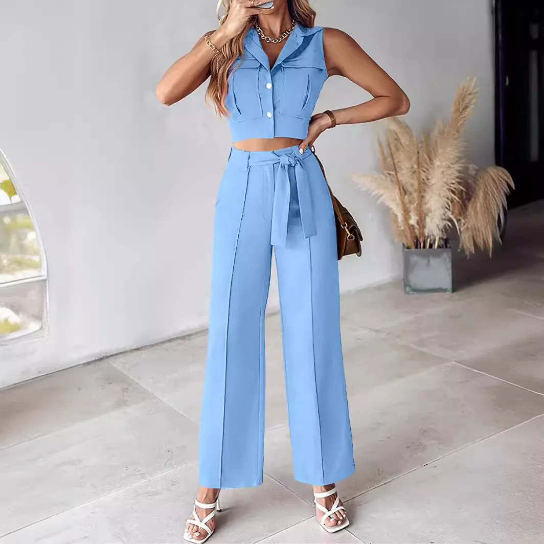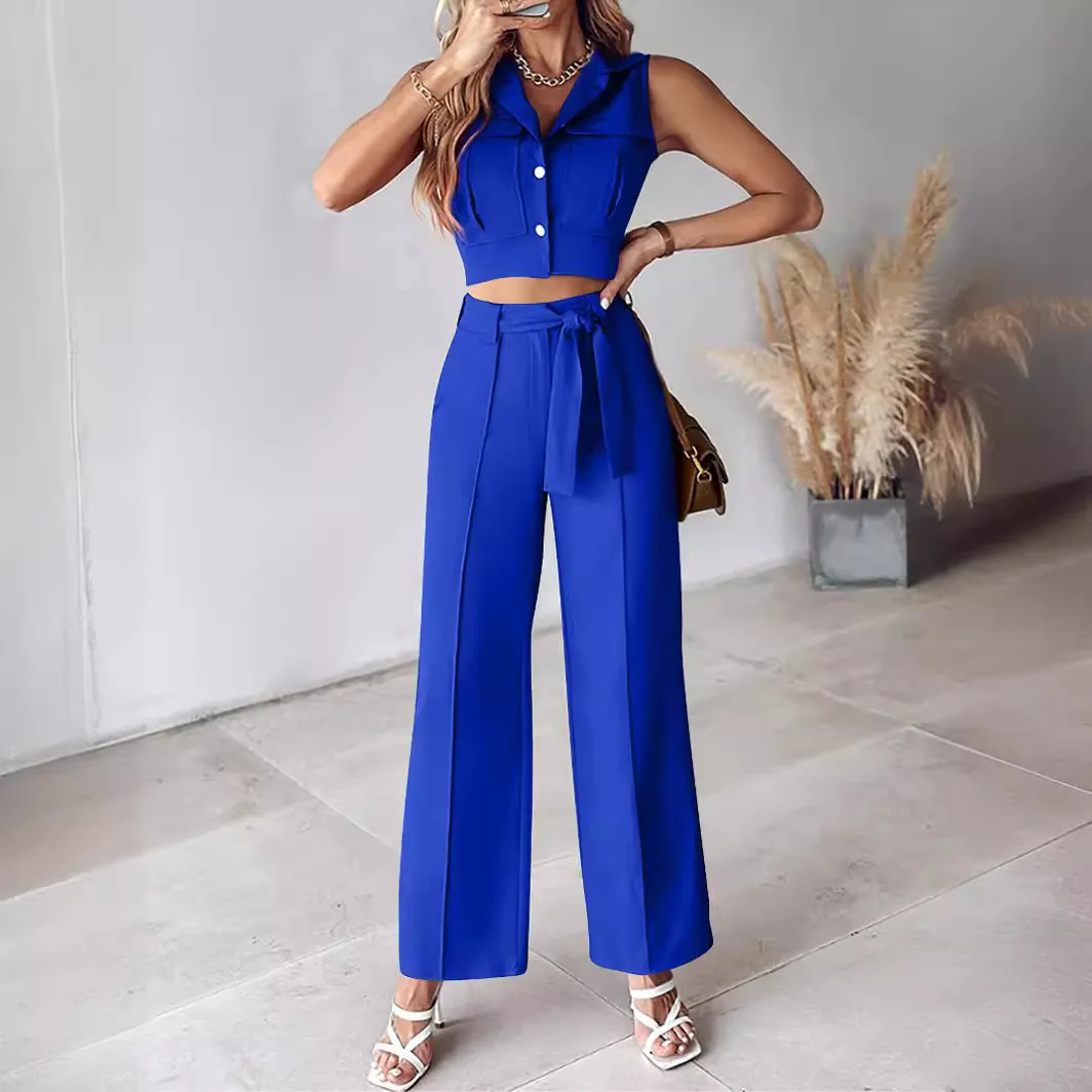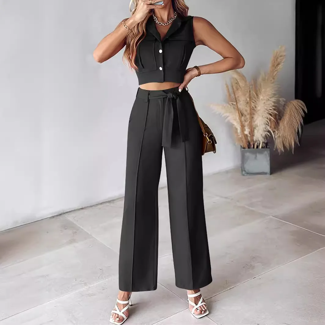 Lady Formal Outfit Sleeveless Lapel V Neck High Waist Wide Leg Lace up Belt 2 Pcs/set Women Top Trousers Set Short Vest Pant Set
