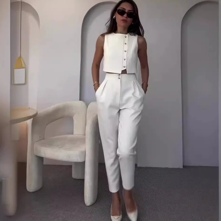 2025 Slim Fit Elegant Women Pants Set Round Neck Sleeveless White Button High Waist Wide Leg Long Pants Vest Tops Two Piece Sets