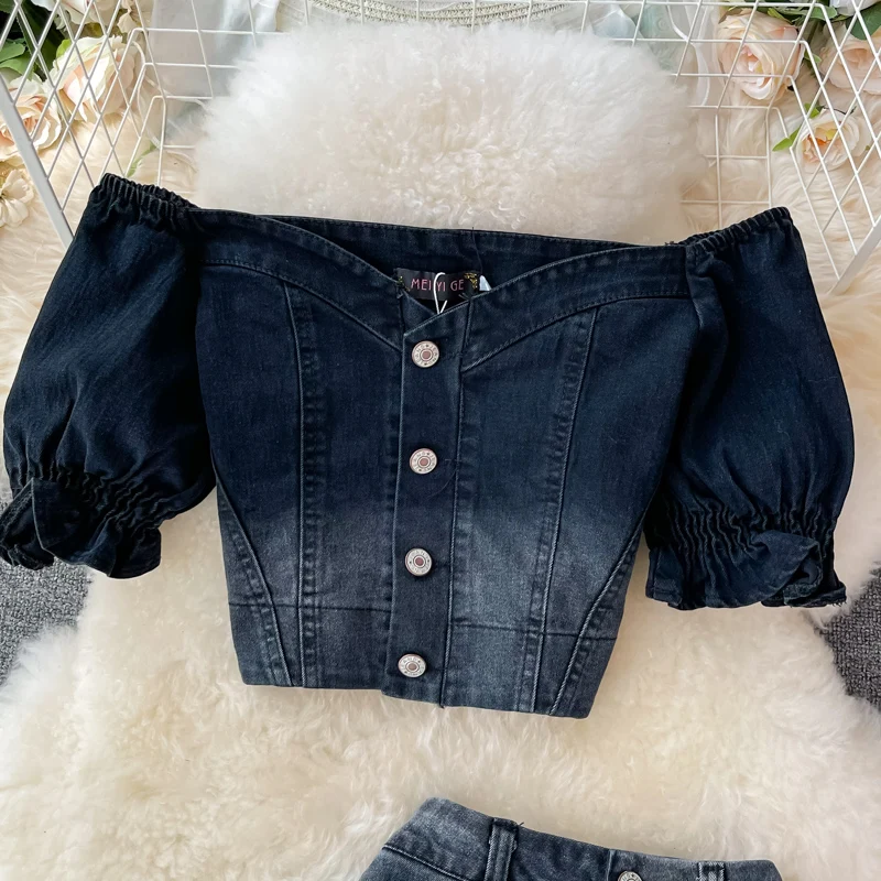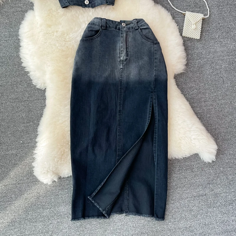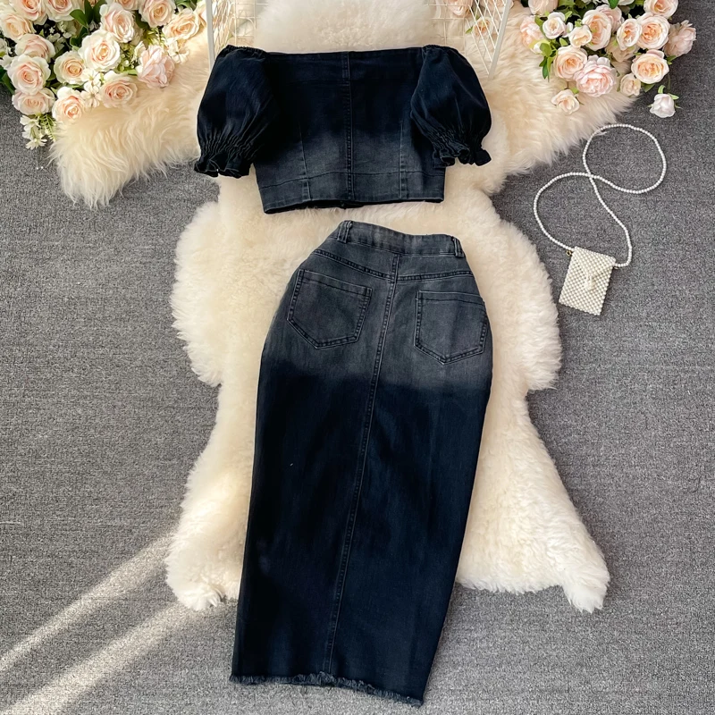 Women's Denim Skirt Top Gradient Color Denim Button Fluffy Sleeve Exposed Navel Top Slim Fit Midi Skirt Paired With 2-Piece Set