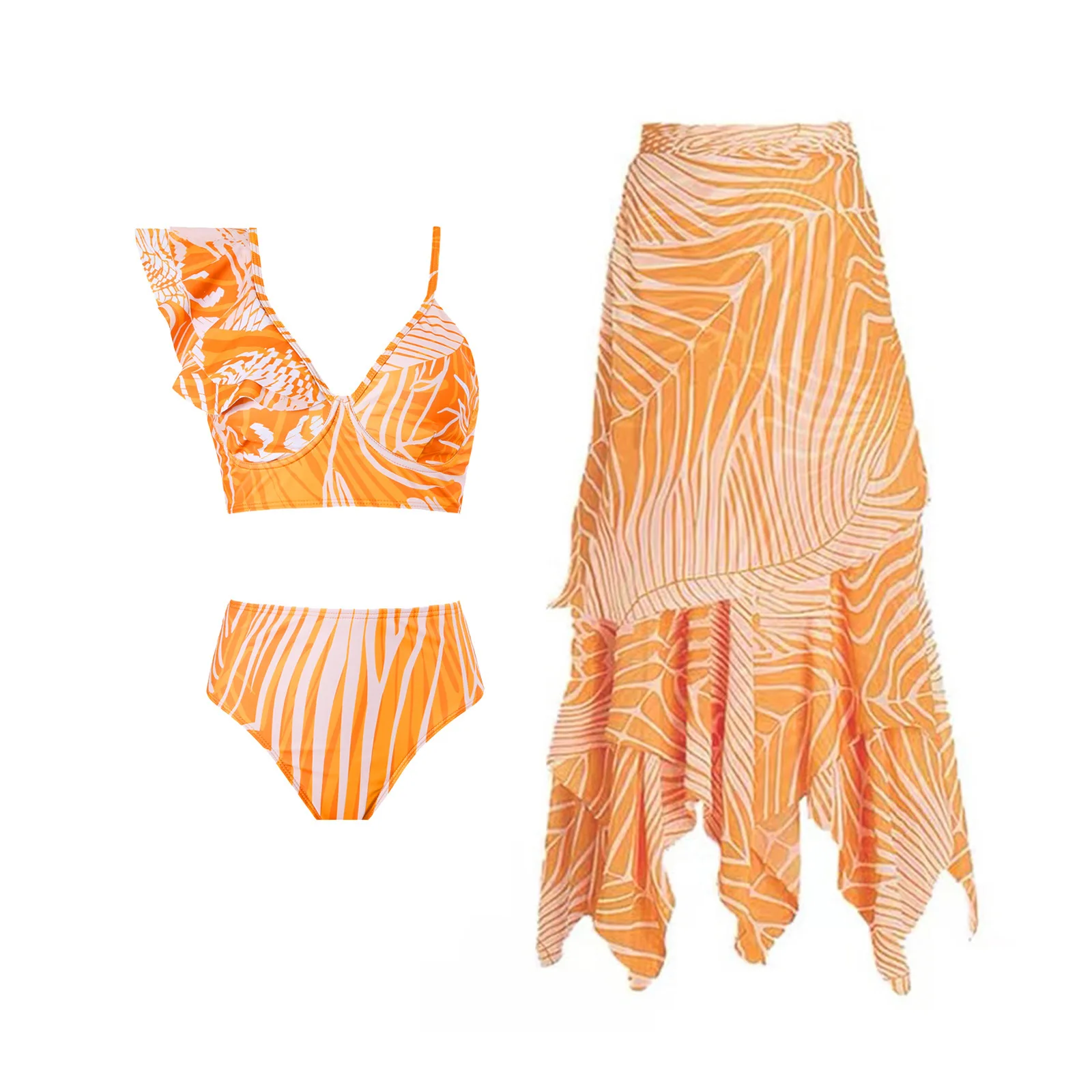 2024 Summer One Shoulder Ruffle Bathing Suit With Skirt Print V-Neck Swimwear and Sarong Two Pieces Swimsuit Brazilian Beachwear