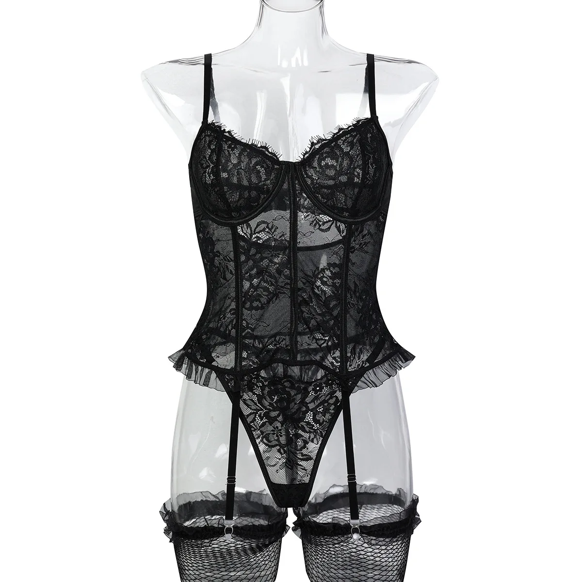 Good Price Women Sexy Lace Lingerie Black Sheer Women Sexy Lace Bodysuit Lingerie With Stocking
