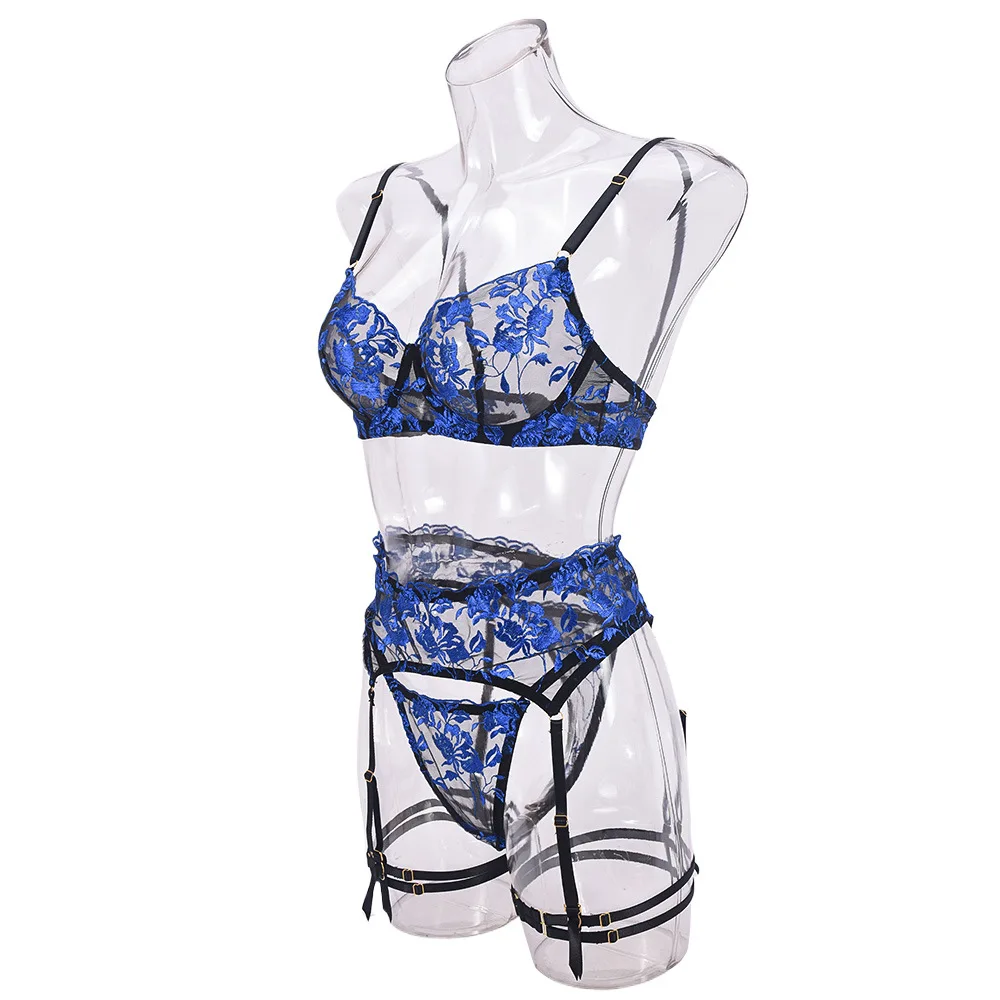 2024 Hot Sales Royal Blue Women Sexy Embroidery Lingerie Set Sexy Women Garter Underwear