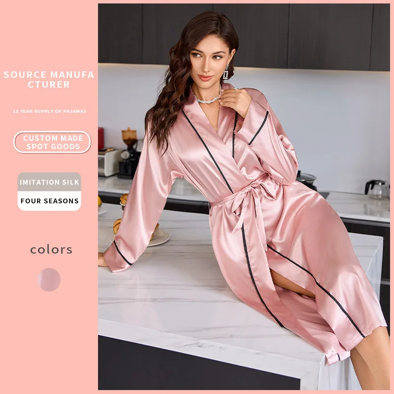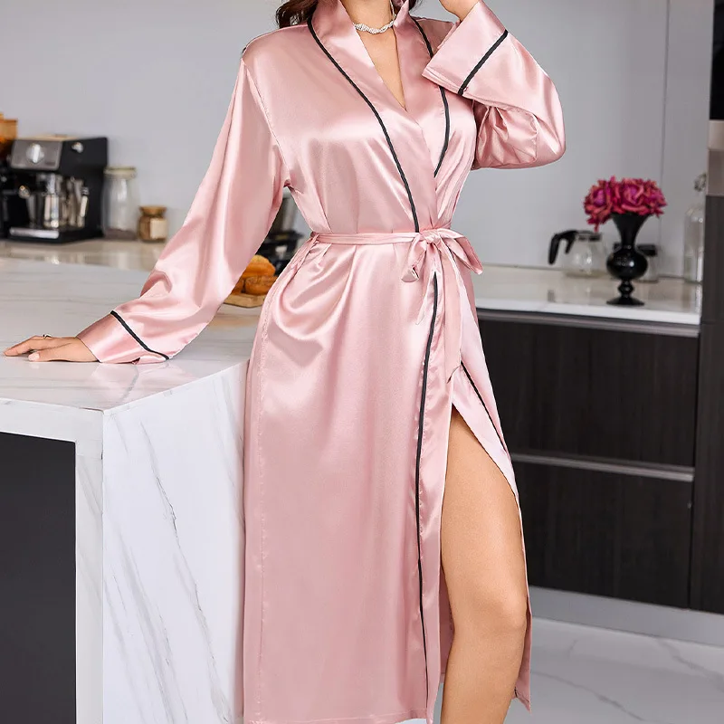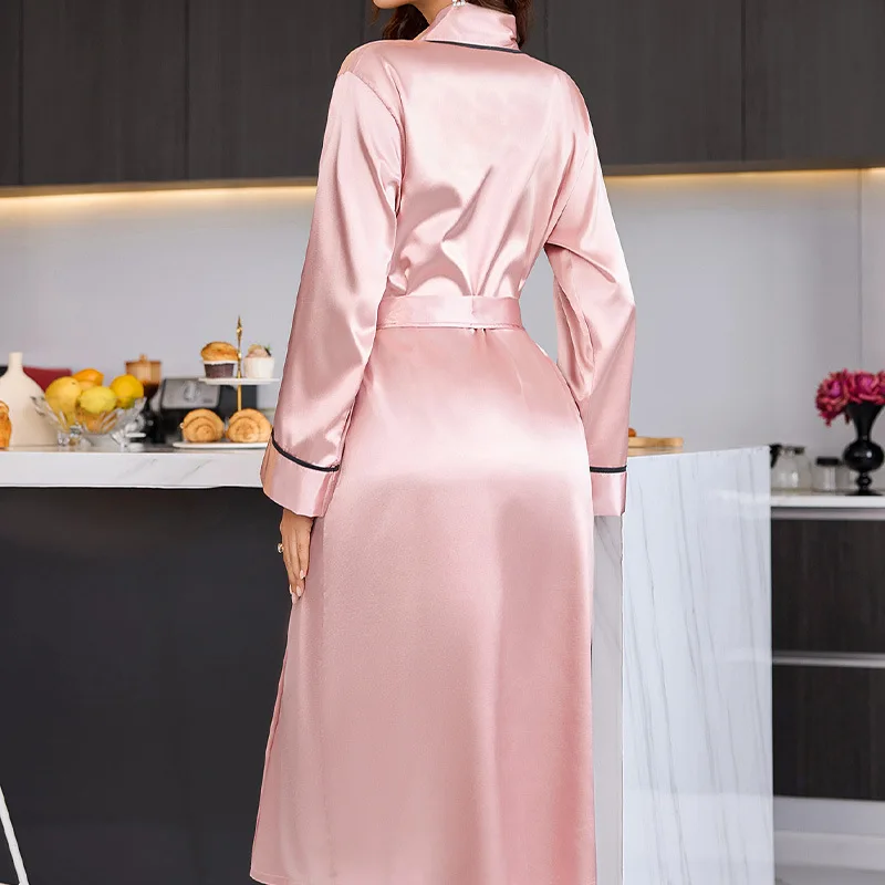 New Cross-Border Long Satin Ice Silk Robe for Women Sexy Nightgown with Lace-Up Closure Casual Fashion Daily Loungewear