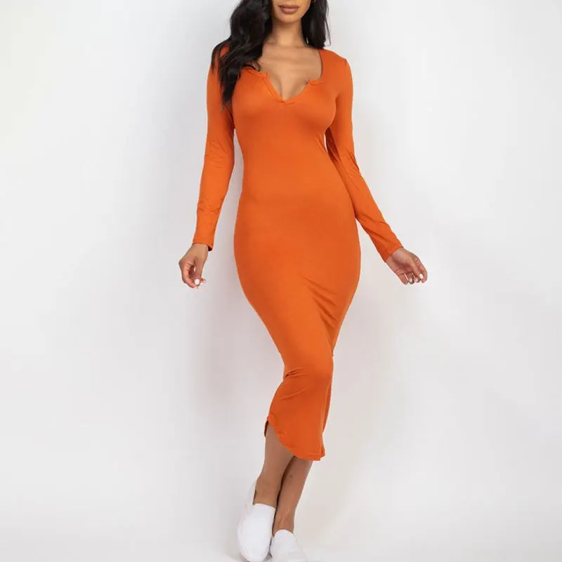 Huili Manufacturer Custom v Neck Skinny Midi Bodycon Knitted Cotton Dress Long Sleeve Red Ribbed Corset Dresses Women