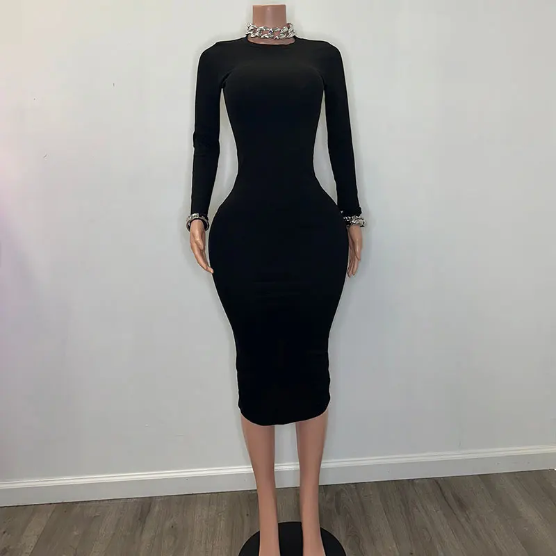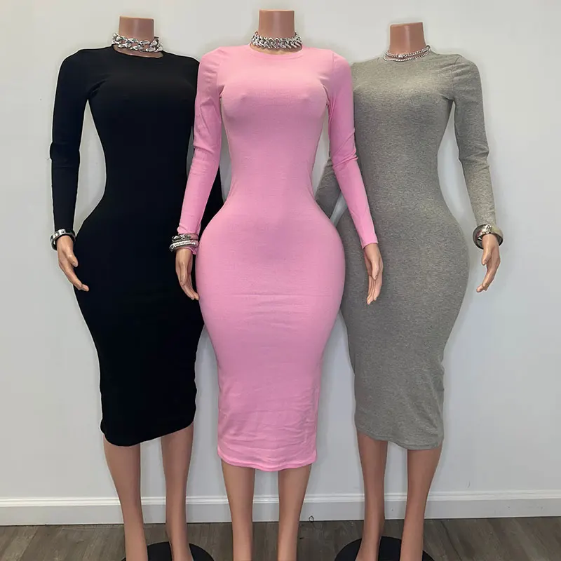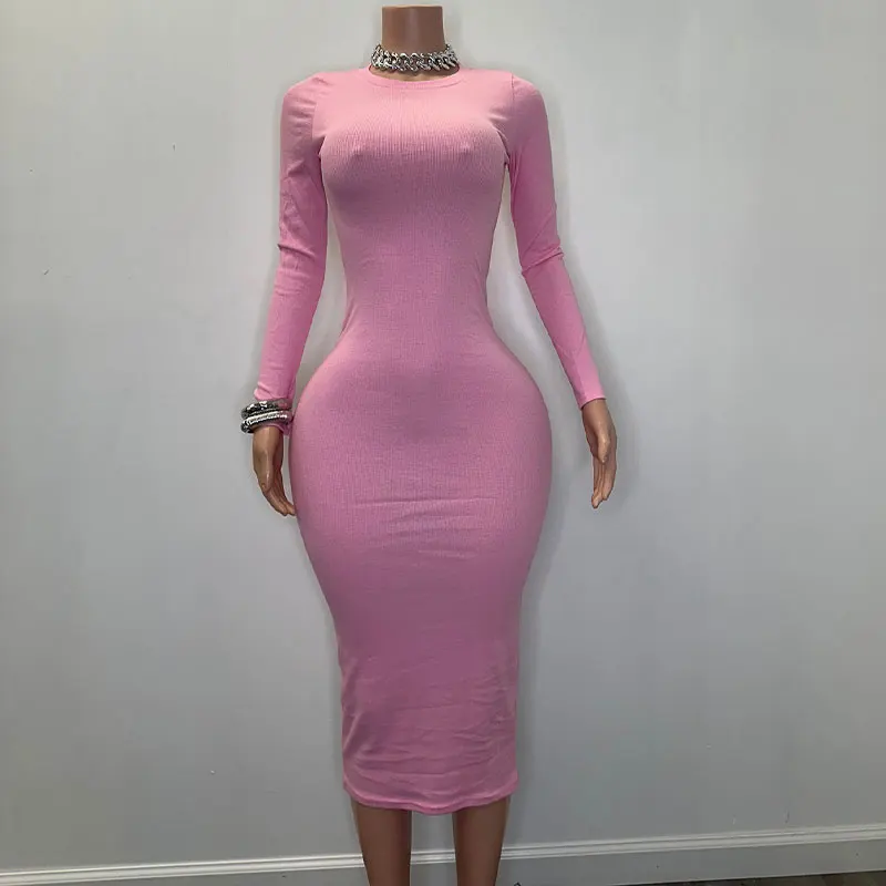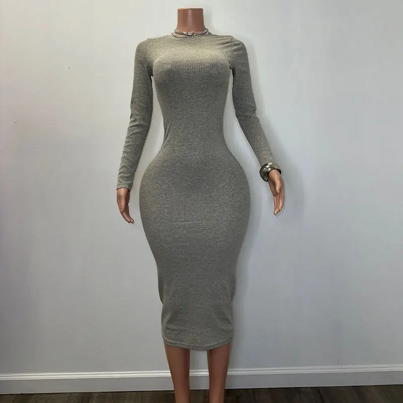 Huili Manufacturer Custom High Quality Rib Kint Dress Bodycon Outfits Crew Neck Long Sleeve Cotton Dress Women Ribbed Maxi Dress