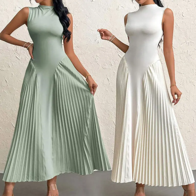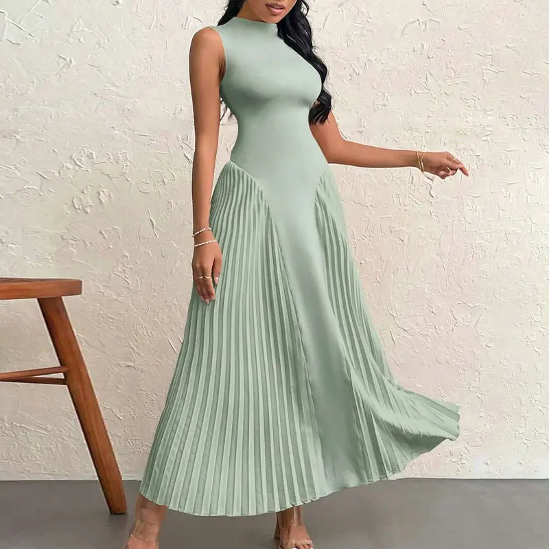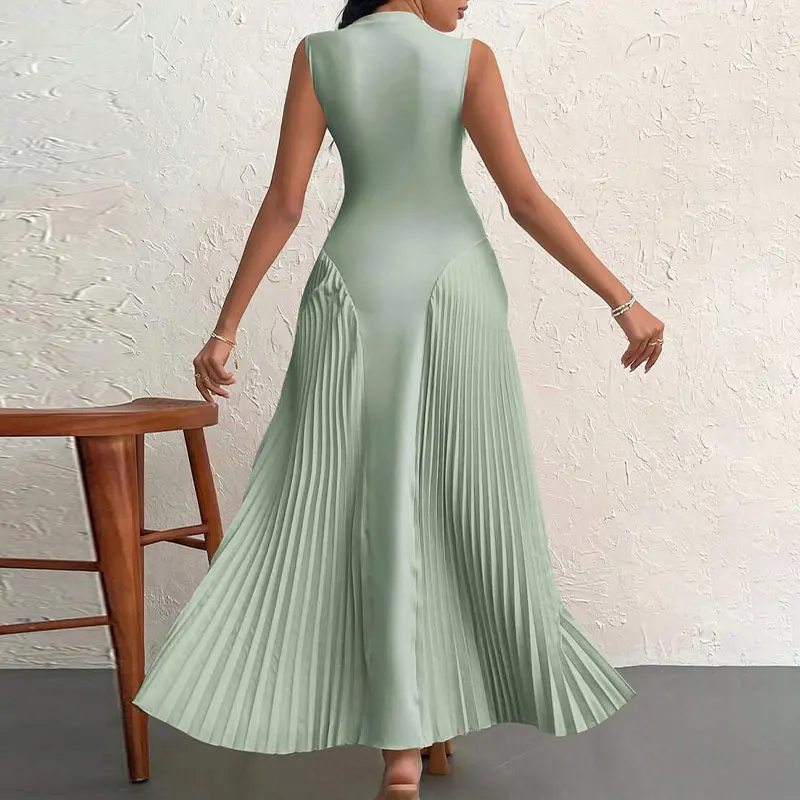 Huili Manufacturer Custom Print Crew Neck Sleeveless Solid Color Evening Luxury Prom Womens Long Elegant Pleated Maxi Dress