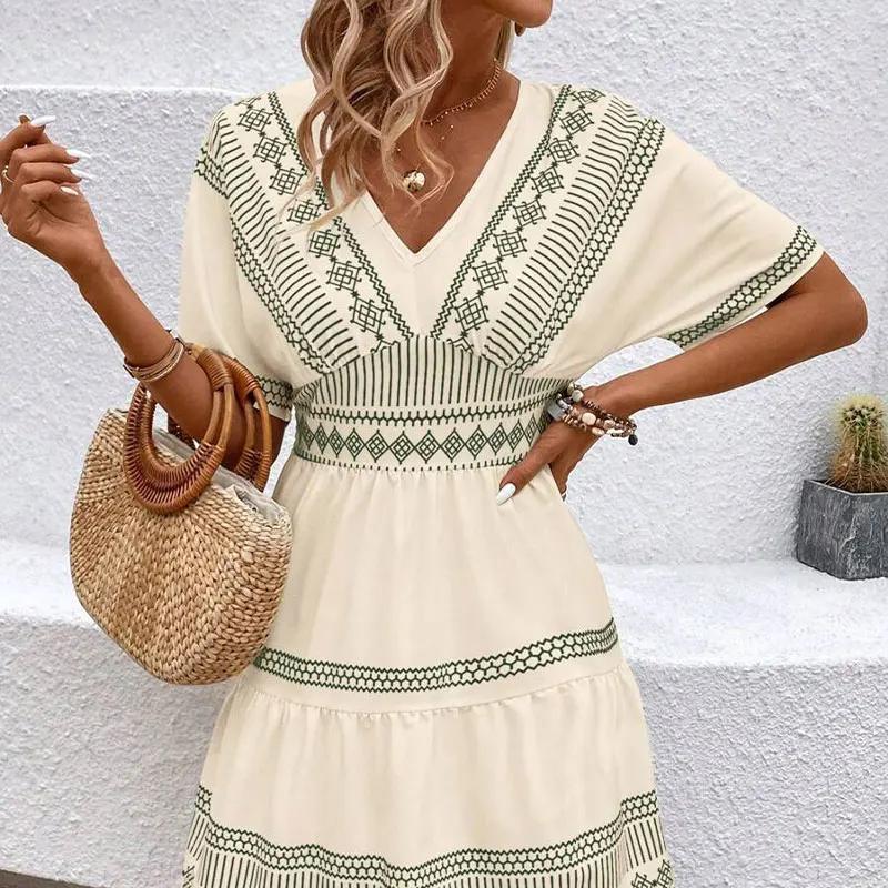 Huili Manufacturer Oem 2025 Summer Holiday v Neck Short Sleeve Polynesian Designer Print Linen Hawaiian Custom Dresses