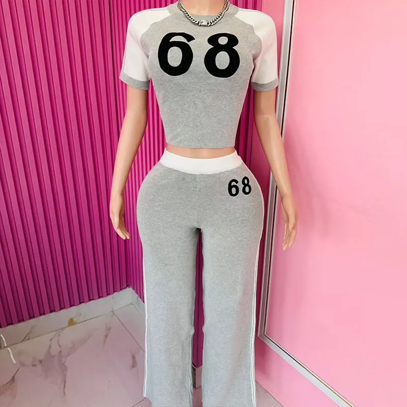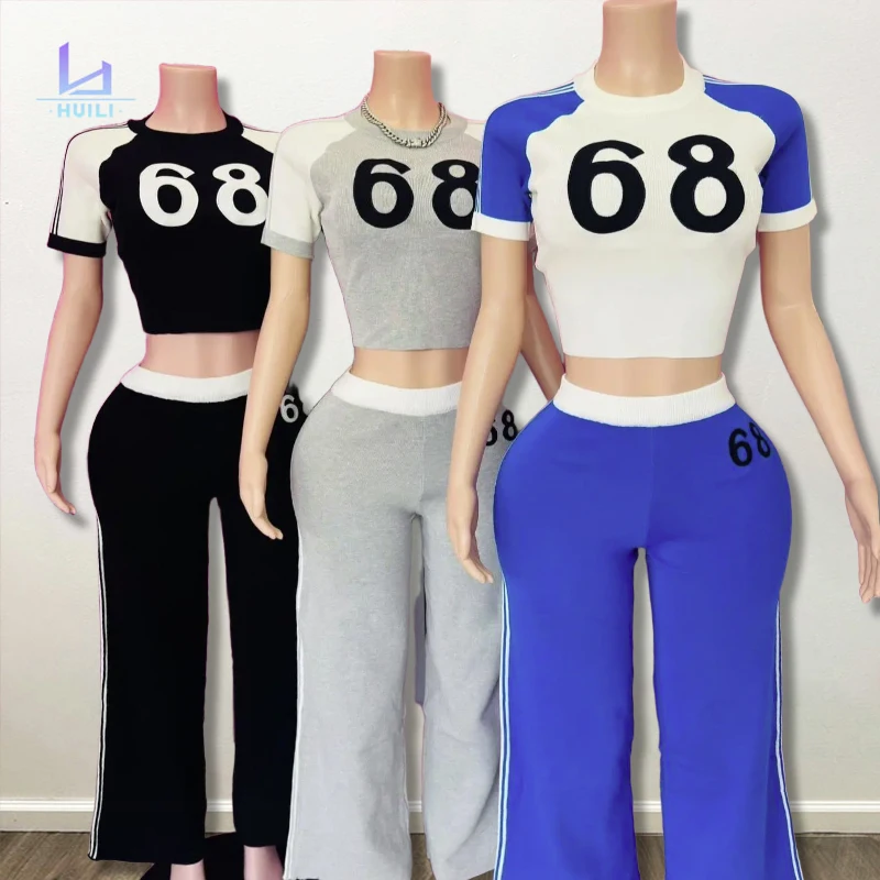 Huili Custom Logo Sports Two Piece Loungewear Pajamas Women Set 100% Cotton Crew Neck Crop T Shirt Baggy Pants Short Breathable