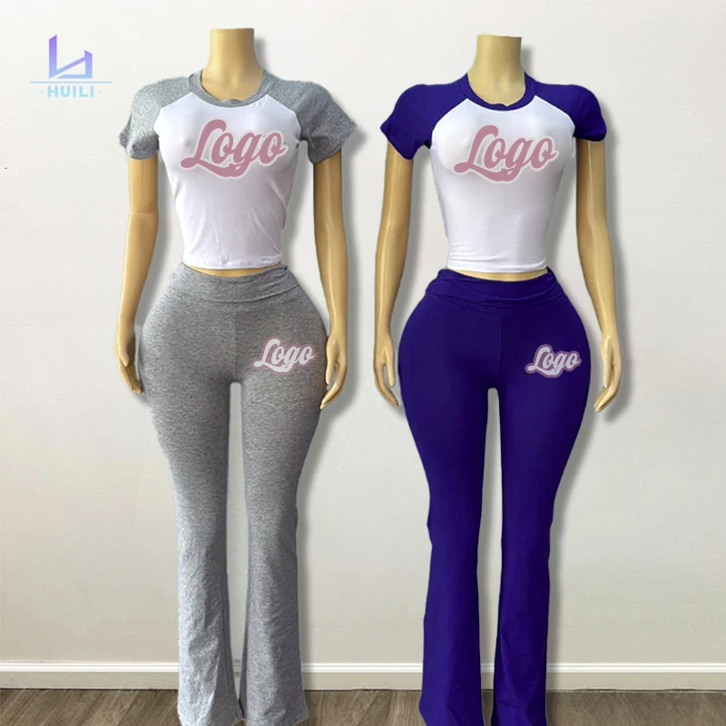 Huili Raglan Shoulder Crop Top Custom logo Two Piece Activewear Outfits Fold Over Flare Leggings Pajama Women Loungewear Sets
