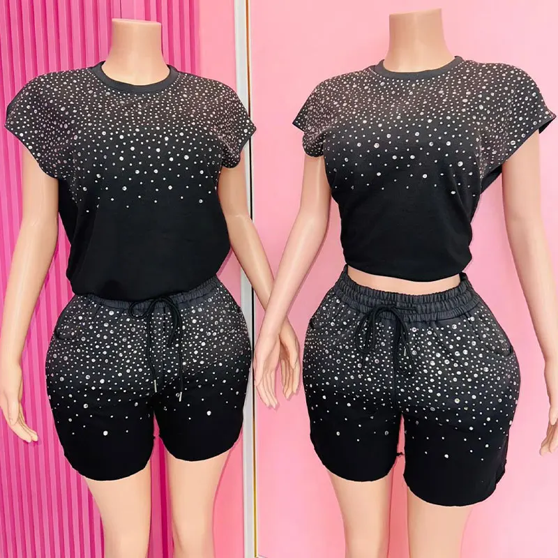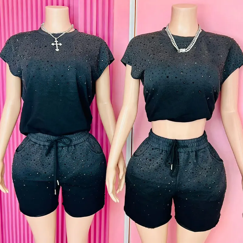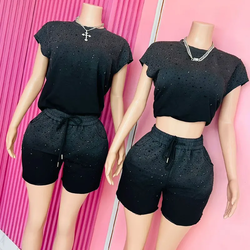 Huili New Arrival Summer Cotton Vintage Washed Gradient Crystal Tee Shorts Loungewear Custom logo Two Piece Rhinestone Set Women