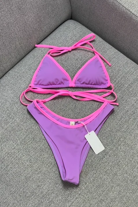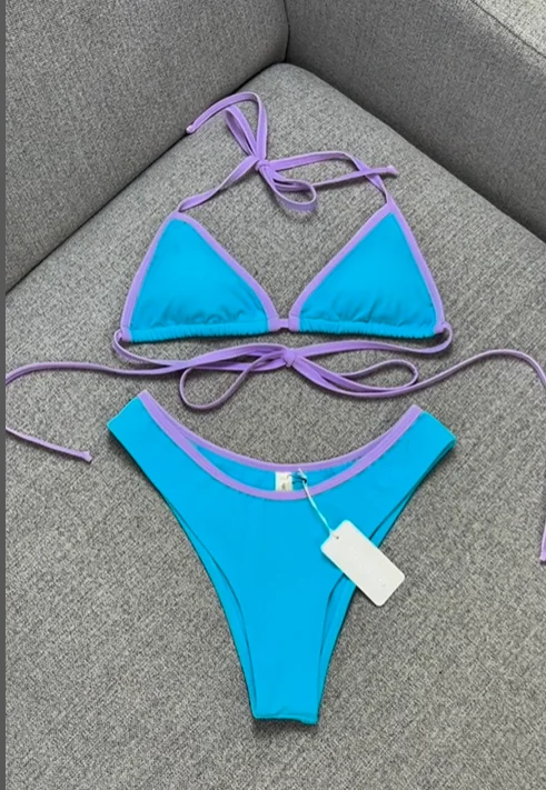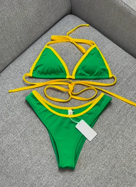 Custom Logo 2025 Designer String Bikini Sets Two-Piece Triangle Contrast Color Print Swimwear Lace Beachwear Spandex/Nylon