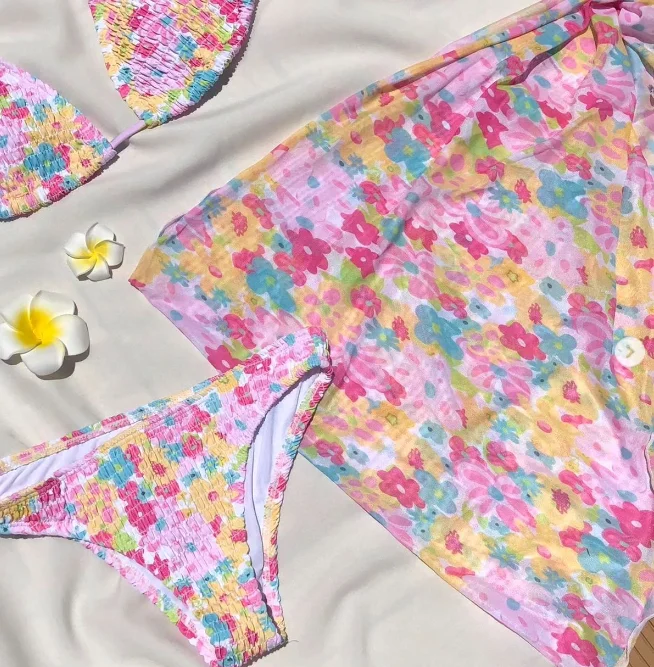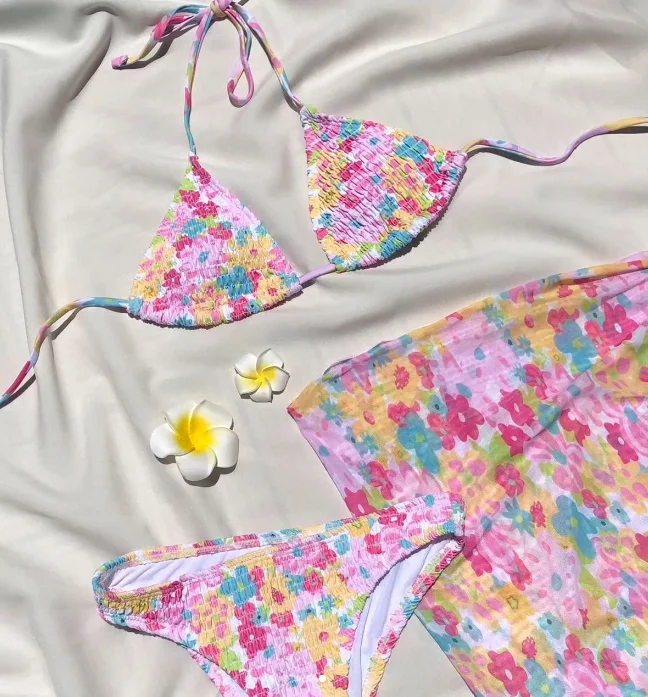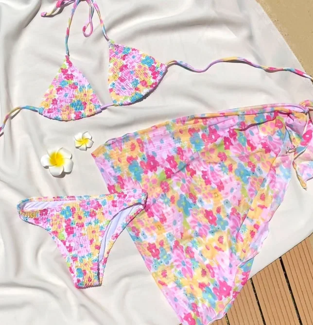 Designer Custom Front LOGO Women Swimwear 2024 Lace up Floral & Striped Print Swimsuit Cover up Dress Triangle Bikini Sets