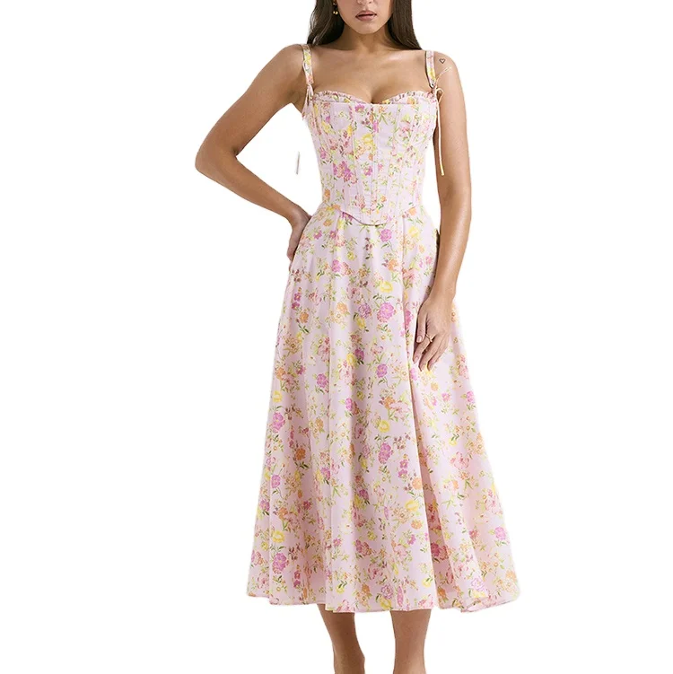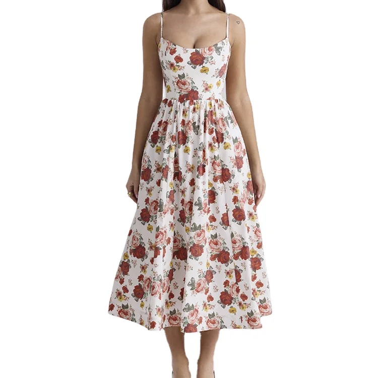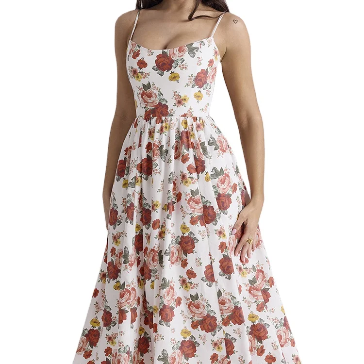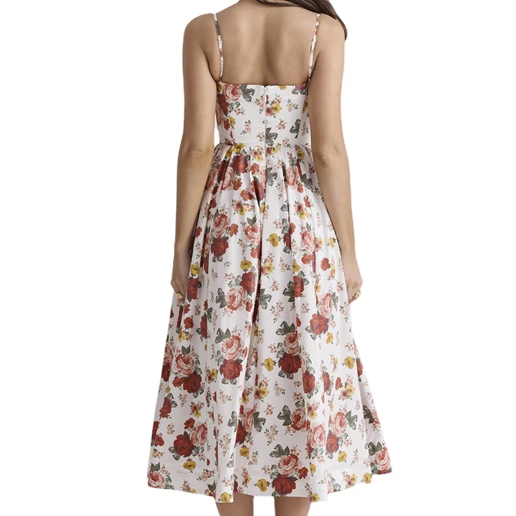 Custom High Quality Summer Causal Floral Print Midi Dress Sleeveless Back Zipper Strap Modest Casual Elegant for Summer