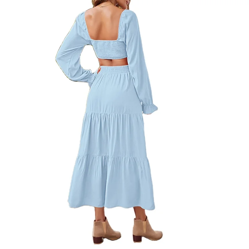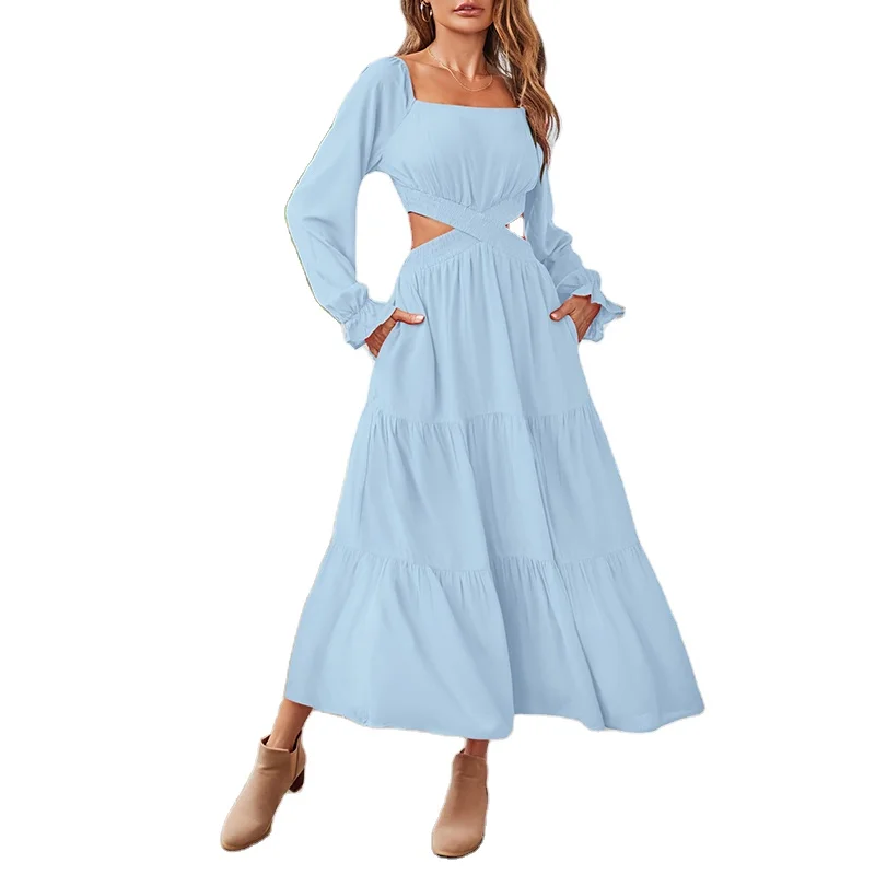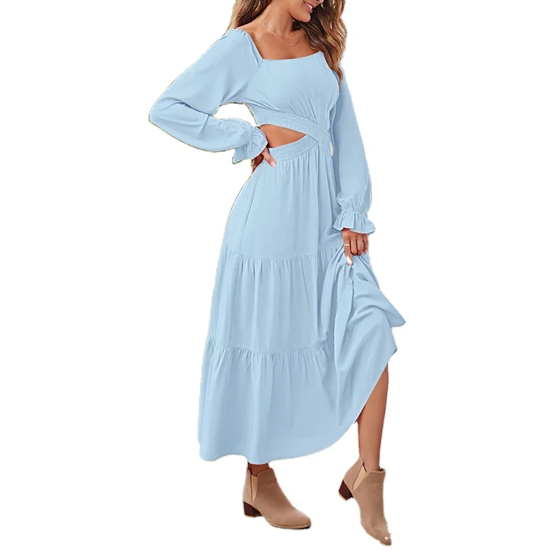 Custom High Quality Summer Causal Color Ladies Dresses Women Long Sleeve Dresses Women Crossover Waist Ruffle Tiered Dress
