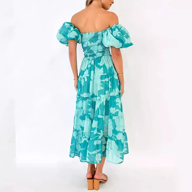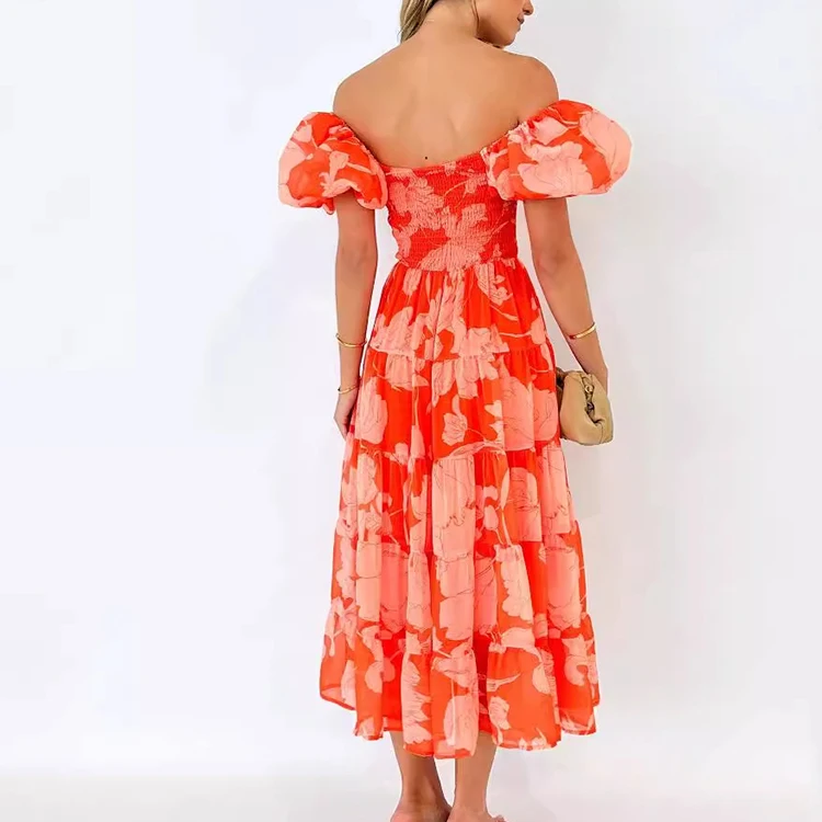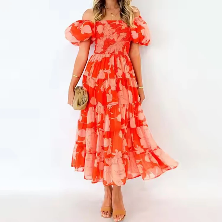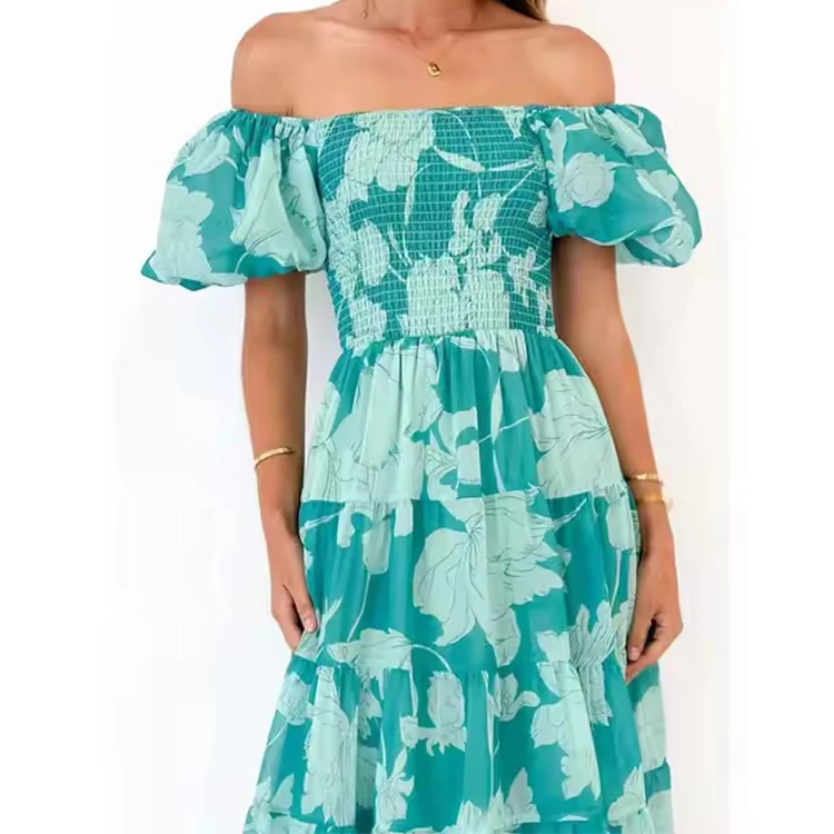 Custom High Quality Summer Causal Dress Elegant Women Off Shoulder Puff Sleeve Women Casual Sexy Elegant Printed Dresses