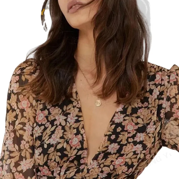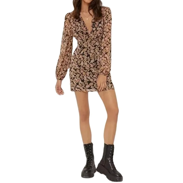 Custom High Quality Summer Causal Dress Fall V Neck Elegant Floral Print Vintage Mini Casual Long Sleeve Women Dresses