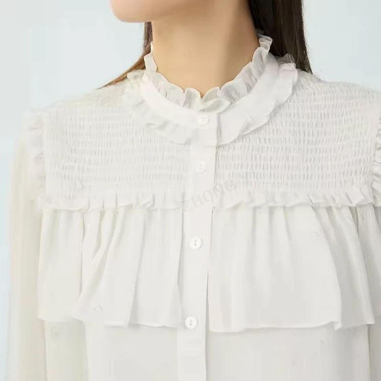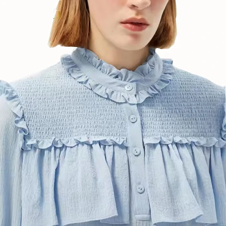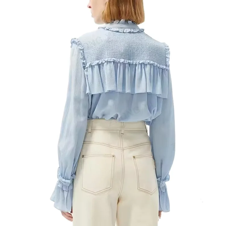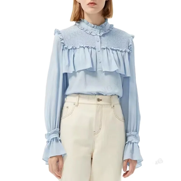 Custom High Quality Spring Autumn Causal Soft Double Sided Long Sleeve Ruffle Cuff and Neck Shirts Blouse Women Casual Tops
