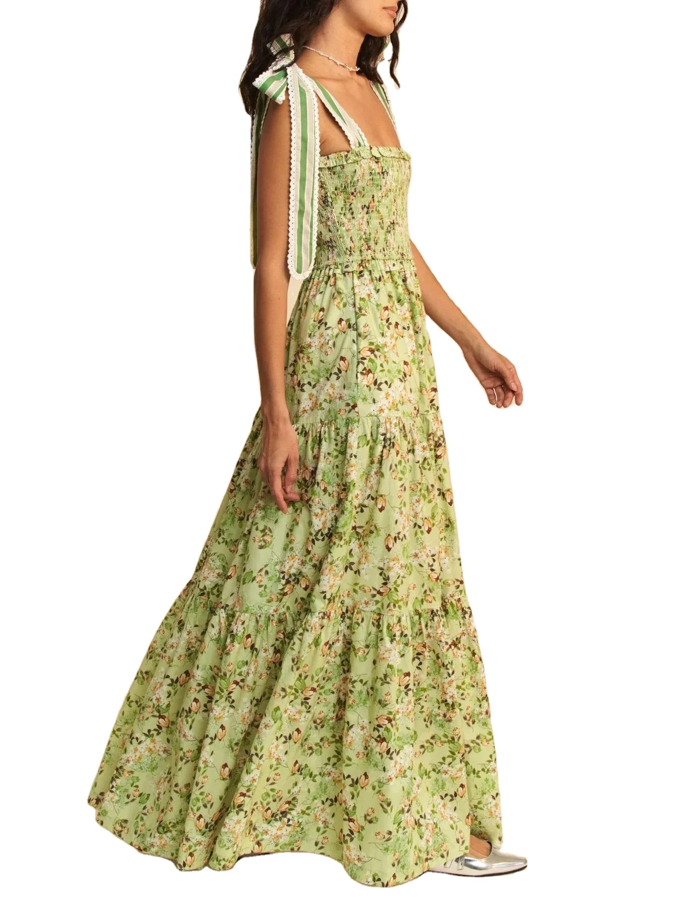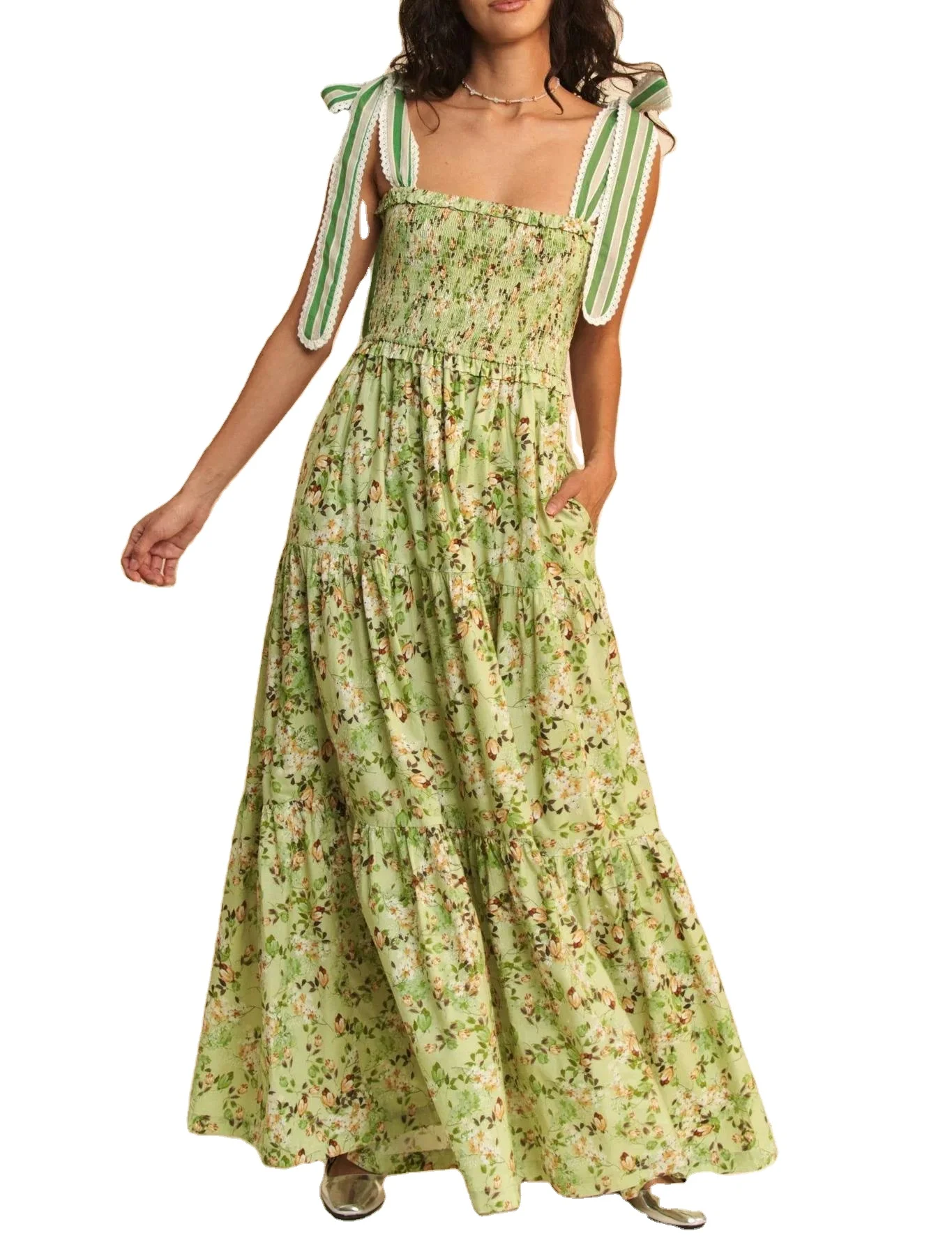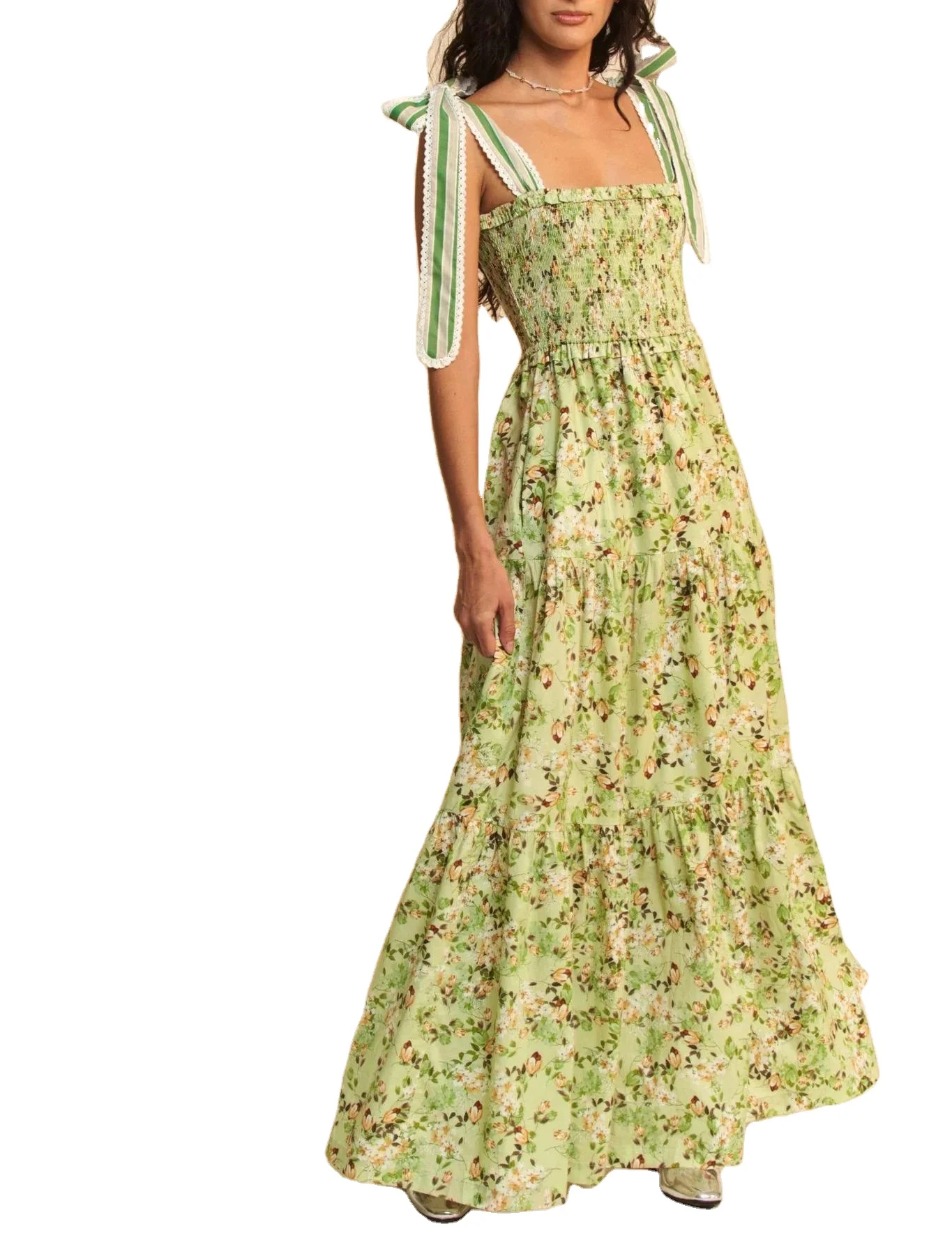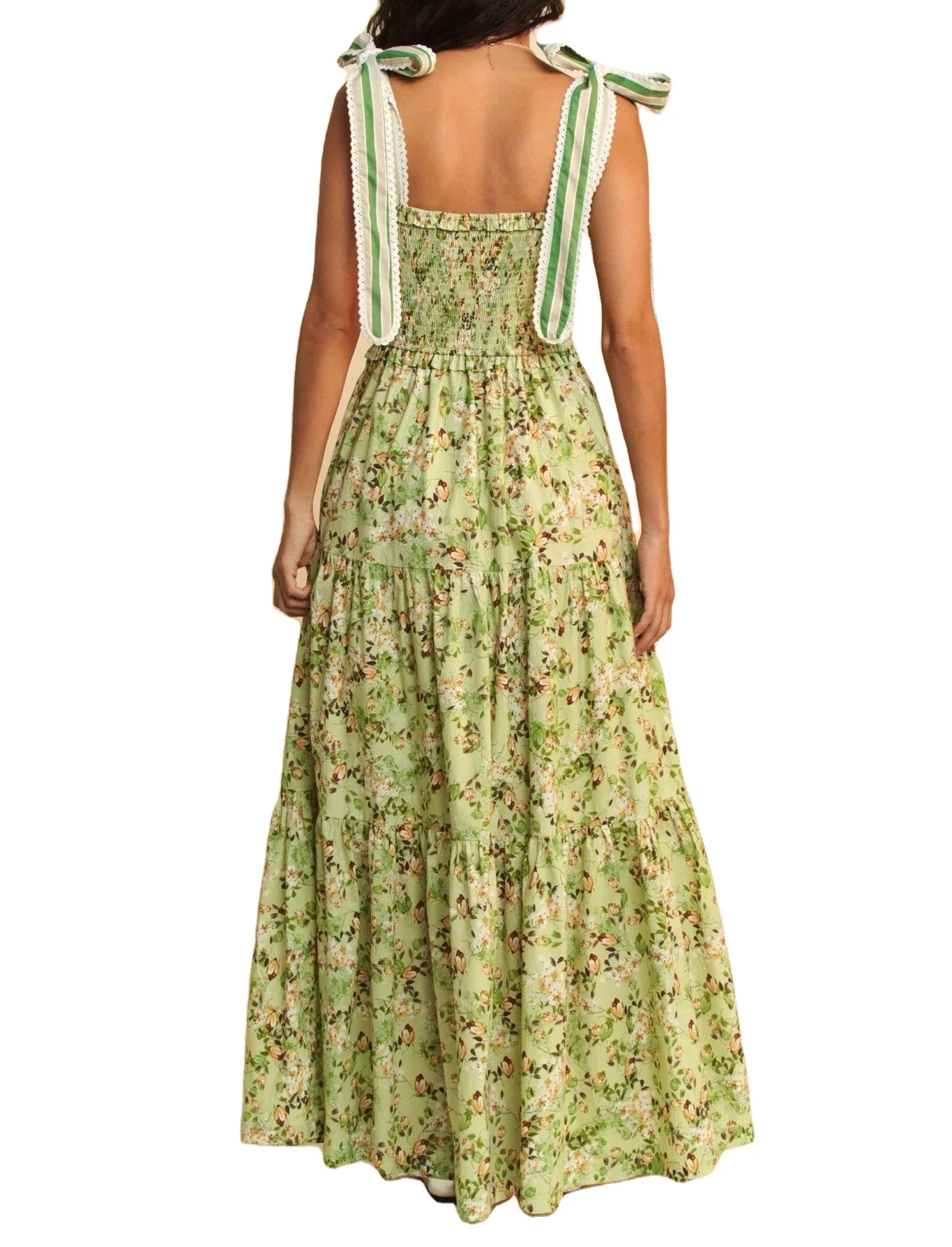 Custom High Quality Summer Causal Dress Floral Print Smocking Bodice Lace Shoulder Strap Elegant Beach Casual Dress